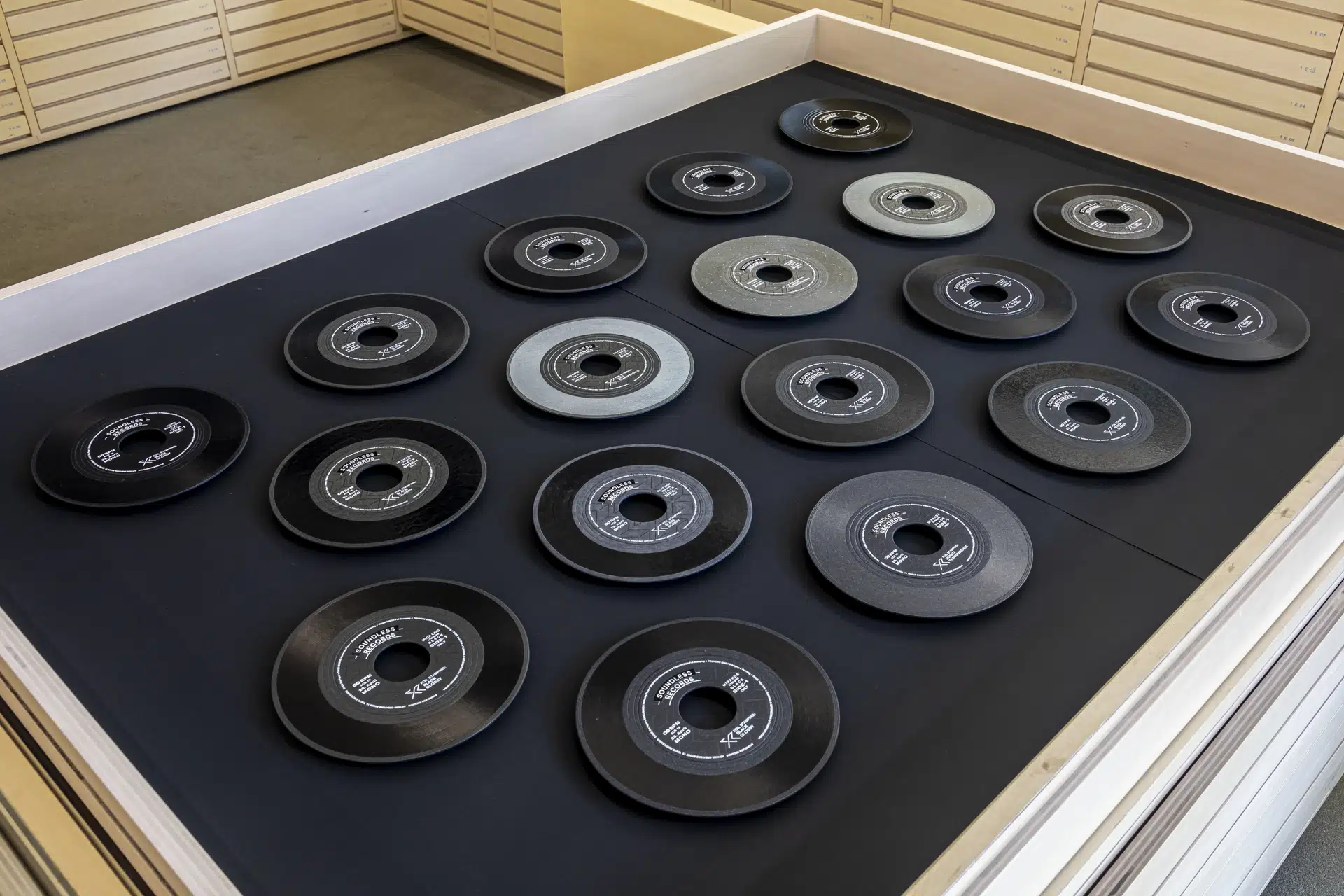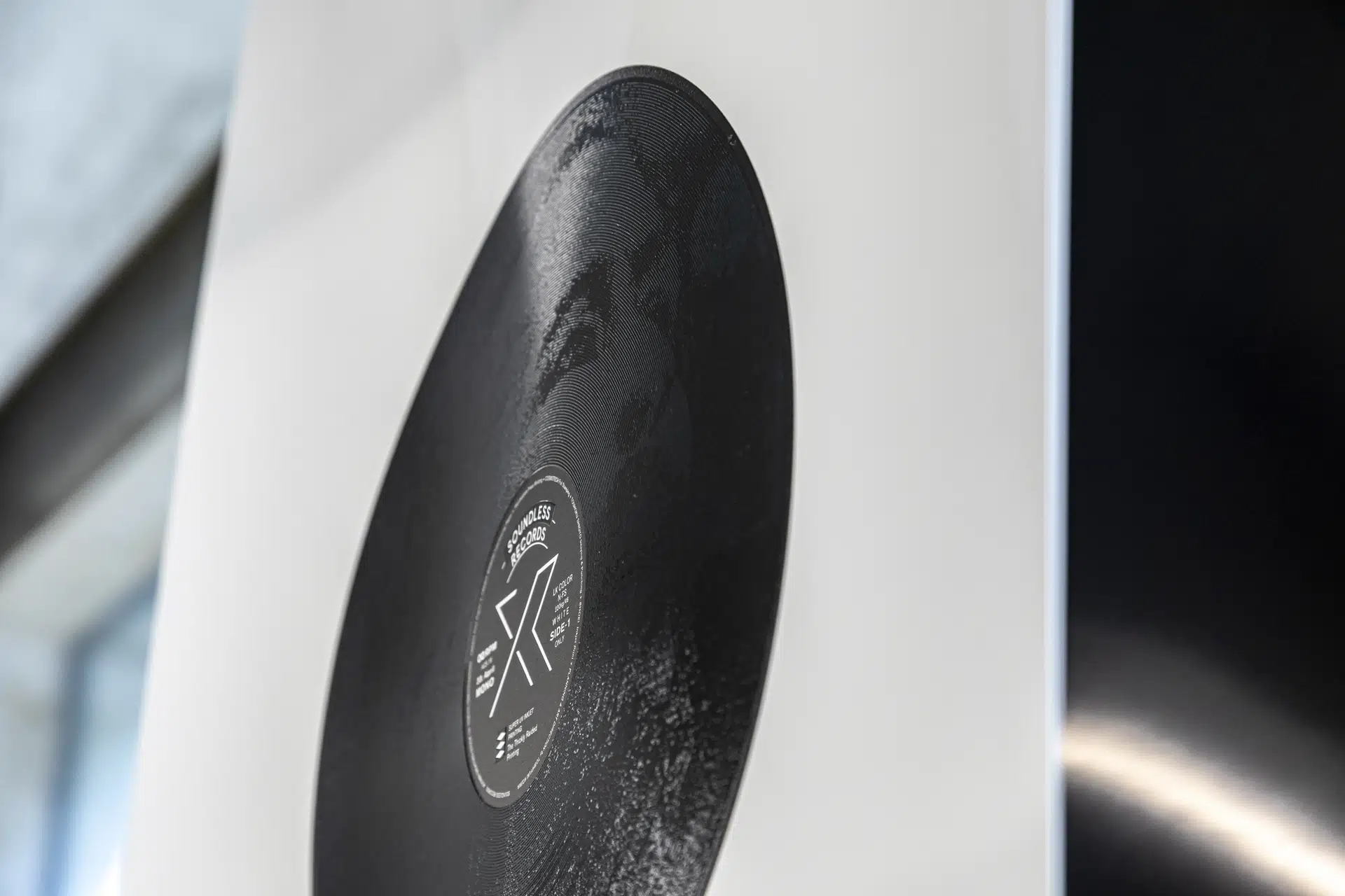 特殊加工とUVインクジェットで出来たペーパーメイドの音のないレコード盤、プレス作業やレコード盤の溝のディテールの