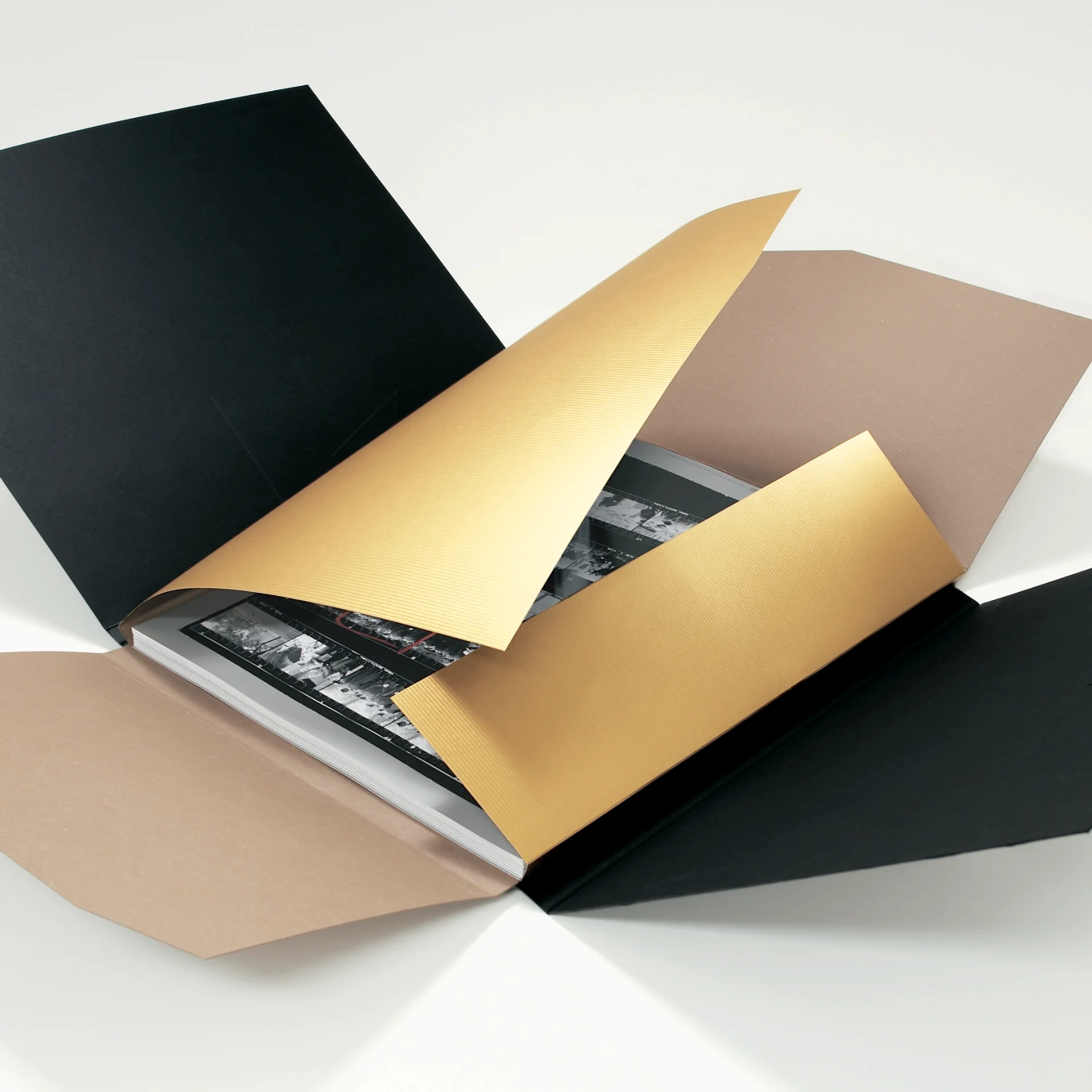 写真は光の芸術。美篶堂の製本による黒いタトウは、作品誕生以前の「闇」を象徴するものです。花が開くようなしなやかさで、印画紙上に定着する光の誕生を予告しています。星条旗の星をモチーフにして刻みとられた光る紙は、「スタードリーム」。コンタクトシートとは、そもそも、写真家の個人的な作業に必要なシークレット・コードのようなもの。だが今回は読者にも理解しうる画面となるように、被写体が認識しうる程度にシートを拡大し、コンタクトに封じこめられた光の粒子を際立たせるよう工夫し、デザインしました。写真集のデザインで最も気を使わなければならないのは、黒の階調の再現です。印画紙の黒をそのまま、印刷で再現することはできません。印画紙がもつ黒の中の黒、白の中の白をいかに印刷で再現しうるのかは、階調を読み解く製版担当者の「入魂の感性」といったものに左右されます。印刷を担当した博進堂の熱意で何度もテストを重ねながら、一年半、どの写真集よりも深い黒の色調の、フランクらしい光のドラマを再現することができました。