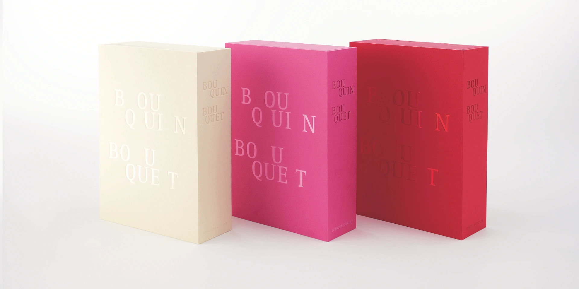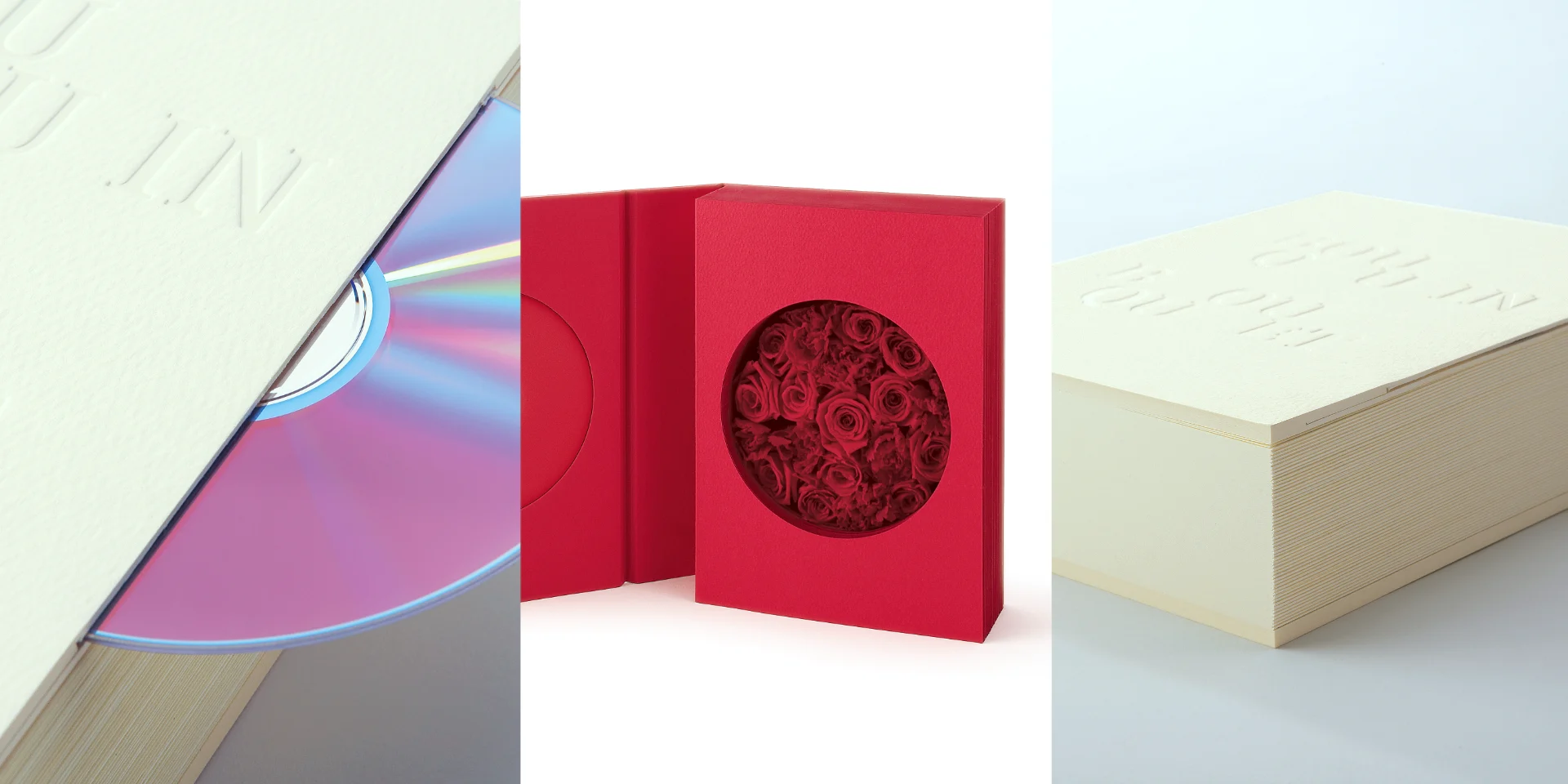 まず最初にお話をいただいてから、どうやって実現するのか試作の連続でした。色紙を使うか印刷するか、本文をくり抜いてどのように本らしさを残すか、表紙の合紙の仕方など試行錯誤しました。表紙はマーメイドのこうばい、赤、ナチュラル、本文はNTラシャのこうばい、べに、白。マーメイドのこうばいは350kgがないので、赤と白の本の厚みに合わせるために枚数を調整しています。全体的に本らしく小口が揃いすぎないようにするために、本文は4つ折りの折丁をアジロ綴じで手製本しました。ただし本のようにめくれてしまわないよう、2枚目からユポのタックシールを入れて、小口側が若干めくれるように緩く止めています。中央の抜きはビク型で1丁ずつ抜いていて、1冊で52丁(416ページ)になります。表紙は赤とナチュラルが9枚、斤量の違うこうばいは20枚合紙です。箔押しした表紙(白は透明箔、ピンクはピンク、赤は赤)、CDを入れる部分、フォトフレームを入れる部分、それらが見える部分の4層構造になっており、それぞれ一度合紙した紙を型抜きしてからさらに合紙するという方法をとりました。ぎりぎり1枚残す精度で背表紙の角にVカットをしていますが、これはマーメイドが品質の良い強い紙だからこそ実現できました。このパッケージには高精度な加工の技が詰まっています。デザイナーさんや加工の職人さんたちと思い入れを共有できる仕事をこれからも目指していきたいと思います。
