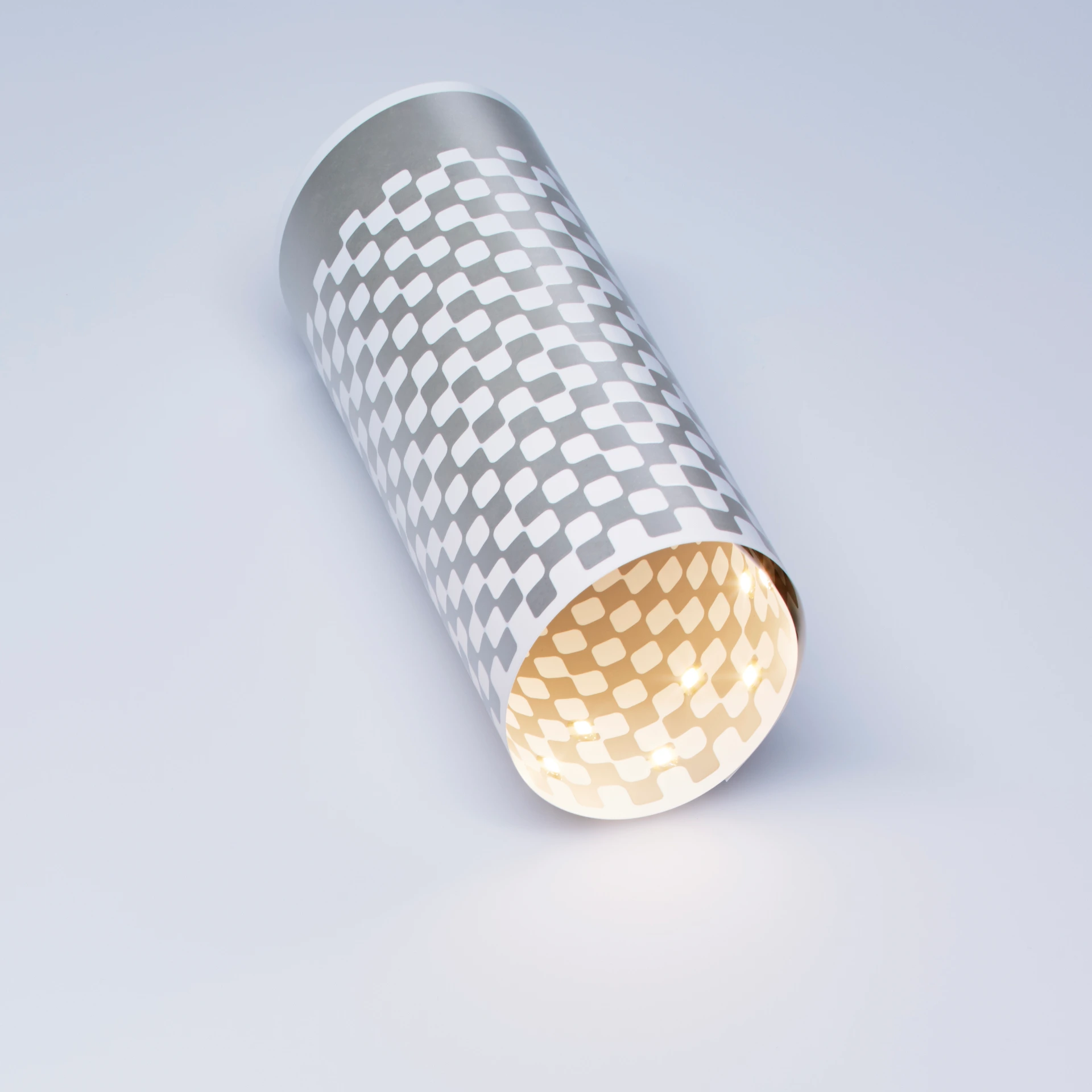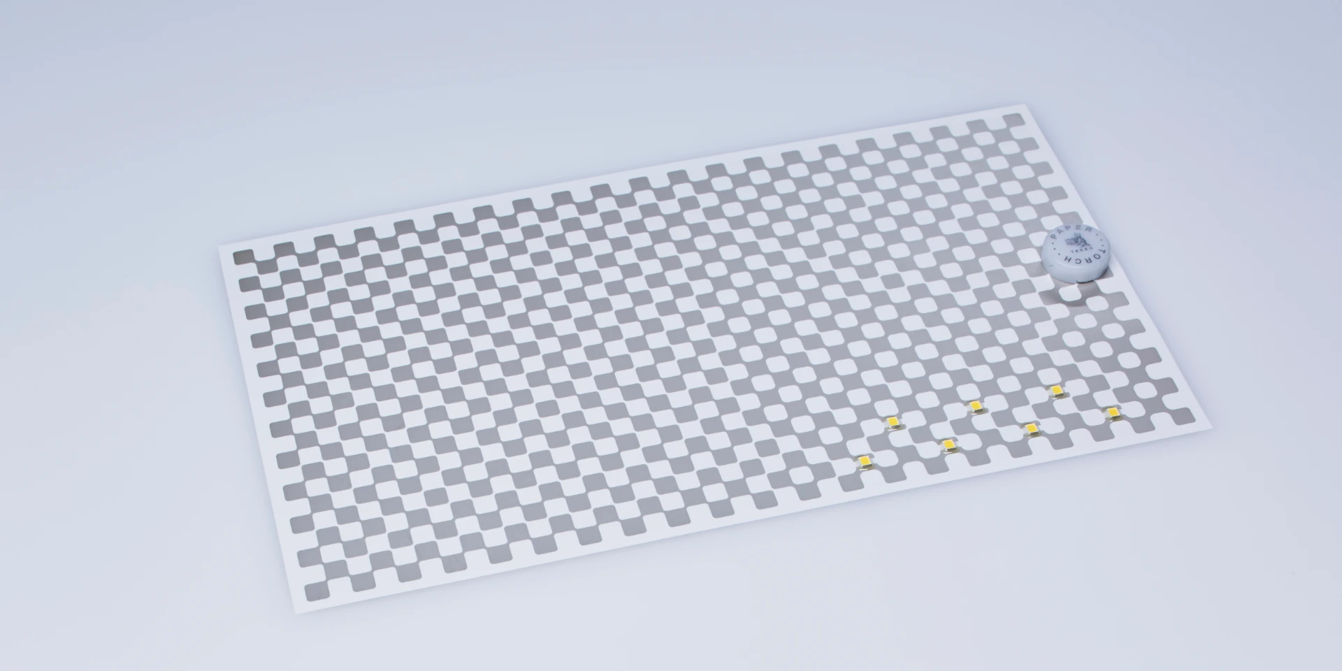 最初は無理だろうと感じたんです。企画書には技術的な制約を超えた提案がたくさんあって、とても実現できそうにない。そもそも紙を巻いたら懐中電灯になるなんて、まるでドラえもんのひみつ道具じゃないかと。試しに様々なプロトタイプをつくってみましたが、本当に形になるのか半信半疑でした。ところがある日、nendoさんから送られてきたスケッチを見て、もやもやが一気に晴れたんです。それが市松模様のデザインでした。何より驚いたのは、回路を剥き出しにしながら、それが回路だと意識させないこと。回路の構成要素は保ちつつ、回路形状を市松模様にすることで、機能と意匠を一体化させている。デザイン史に残るエポックメイキングなことだと感じました。とはいえ技術的には難題の山。例えば、ユポに銀インクがのった後、どのように強く定着させるかは悩みの種でした。銀インクの下に透明なレイヤーを引くことで解決できましたが、その他にも無数の試行錯誤が必要でした。一方、今回の開発では、紙にインクをのせるという印刷工程そのものは従来と変わっていません。同じつくり方でも、出口を変えることで老舗の力を最先端に変えているんです。文字や絵を刷るという既成概念から離れ、多様な素材をのせていく創造のプロセスだと捉え直すと、紙と印刷は未来になっていきます。そんな発想の飛躍を繰り返してきた企業だけがこれまで生き残ってきたはずですし、きっとこれからもそうでしょう。「PAPER TORCH」がそのトライアルの一助になれば嬉しいです。