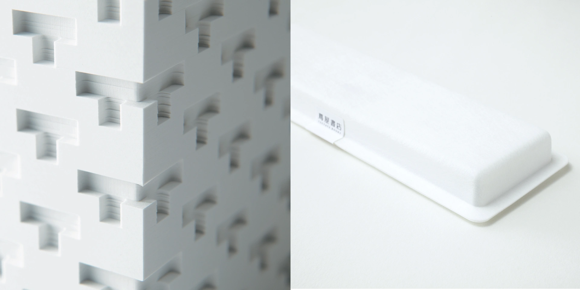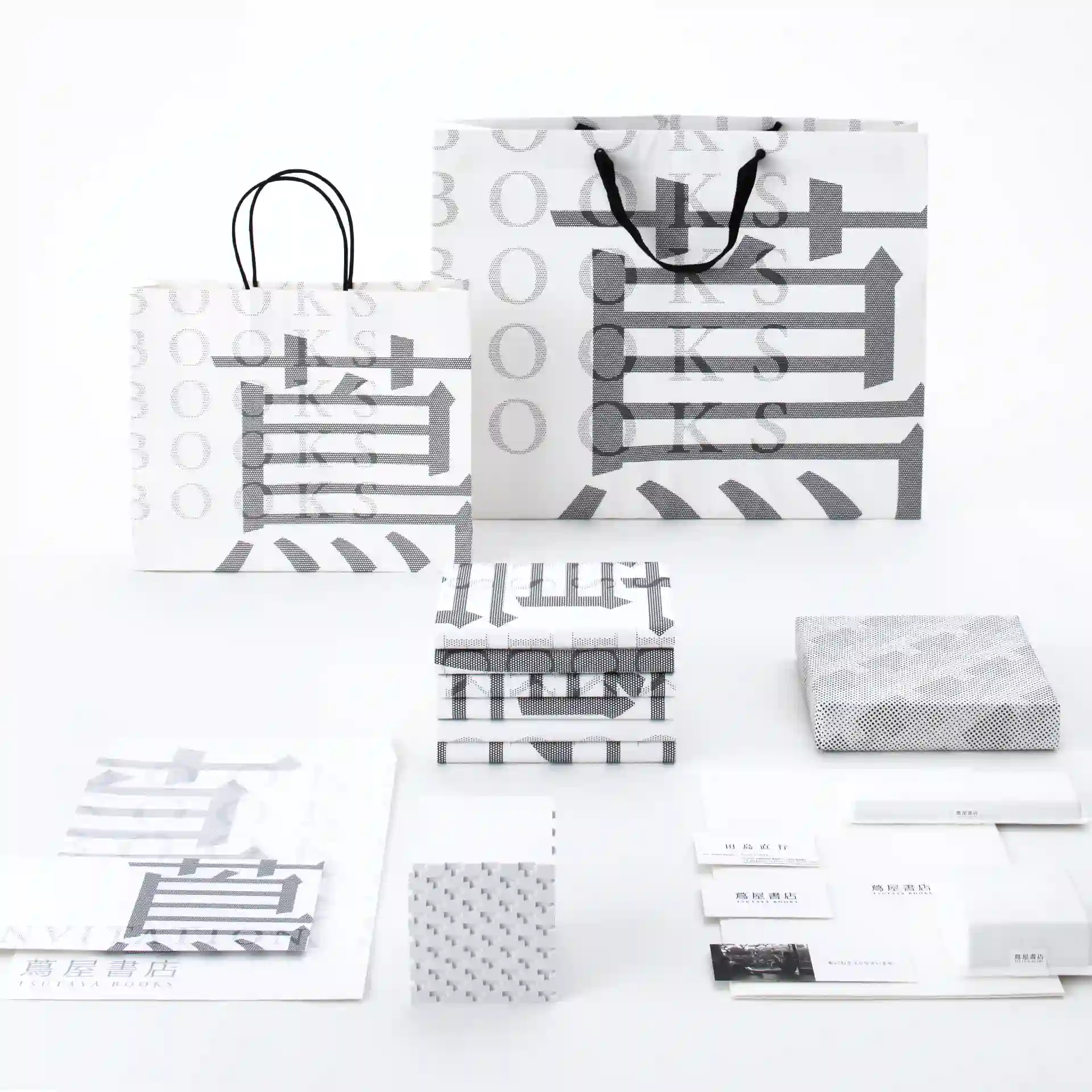 代官山 蔦屋書店に行ったらまず店内のサインを見てください。1mmの薄さのパンチングメタルの透過性が、店内の導線をつくっています。パンチング素材のドッツパターンを新規会員カードからショッパーなど、各種グラフィックツールに展開しました。主に使用しているのはアラベールの新色、ウルトラホワイト。このマットな白さが、ドットの配列をより効果的に浮き立たせています。一方、クライン・ダイサム・アーキテクツによる建築の外観は、表面に丸みをもった「T」のブロックで覆われています。オープンを記念してつくったプロダクツには、外壁の複雑な「T」のパターンをエンボスで再現したタトウをつくったり、メモブロックの表面に「T」の凹みを彫り込んだり、不織布にモールド加工を施したパッケージをつくったり…と、短期間ながら技術的な試みも随分とたくさん行いました。紙を含む素材を選び抜いたプロジェクトだったと思います。