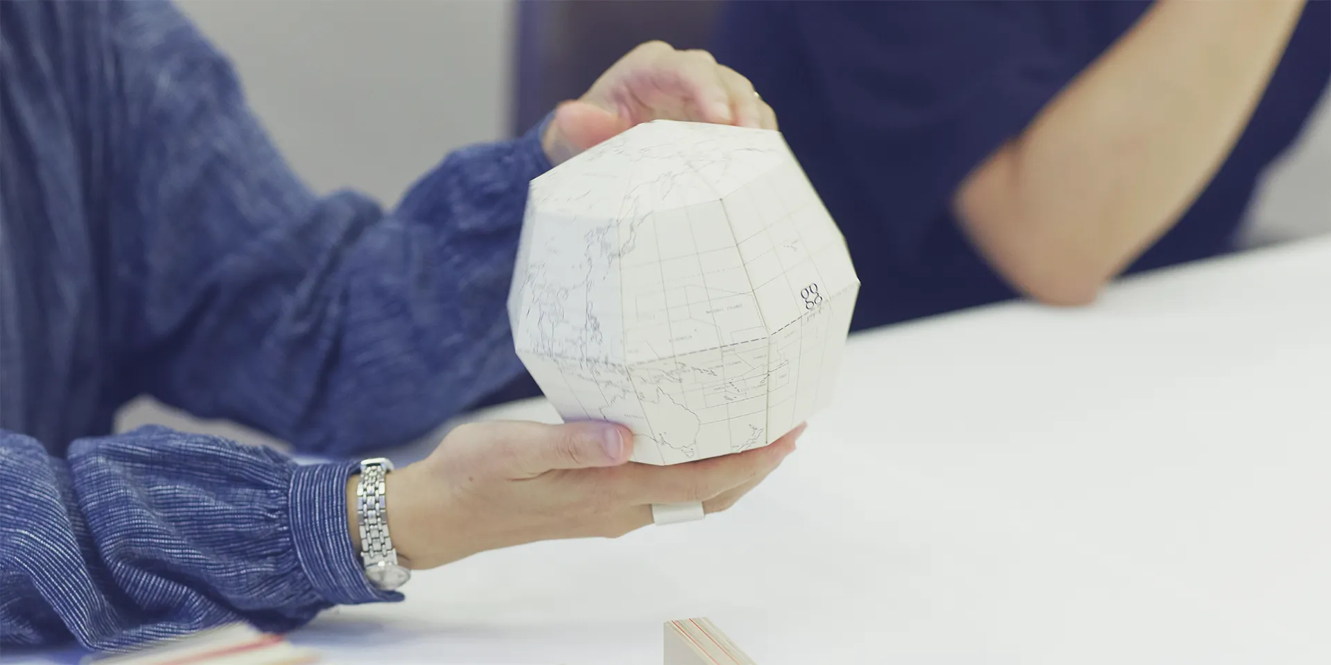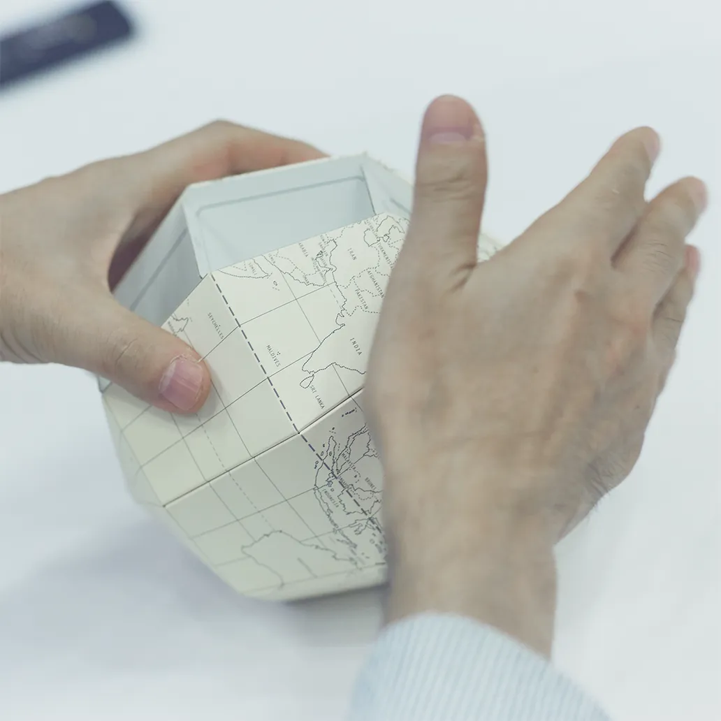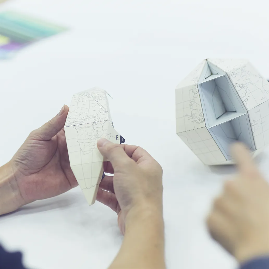 既存の価値観が揺らぐことで、それまで見えなかったことに気づけるようになりますよね。グラフィックのデザイナーをやっていると、どうしても完成品としての紙のことだけを考えがちですが、その手前には製紙工場があって、木材があって、森がある。そこまで視野を広げると、紙を使う以前のステップに対しても何かアクションできるんじゃないかと思うことがあります。私たちが「geografia」という地球儀をつくったときにも、「地球って丸いんだ」ということに改めて気がつきました。天気図のような平面地図ではどうしても地域が分断されがちですが、丸い地球儀で見るとアマゾンや北極がひとつながりにあることが実感しやすくなる。分かっているようで感じられていないことが実はまだたくさんあるのに、デザイナーって意外と視野が狭くなっていたりします。竹村さんとお話しているとそういう部分の窓がパカパカと開いていく感覚があるんです。