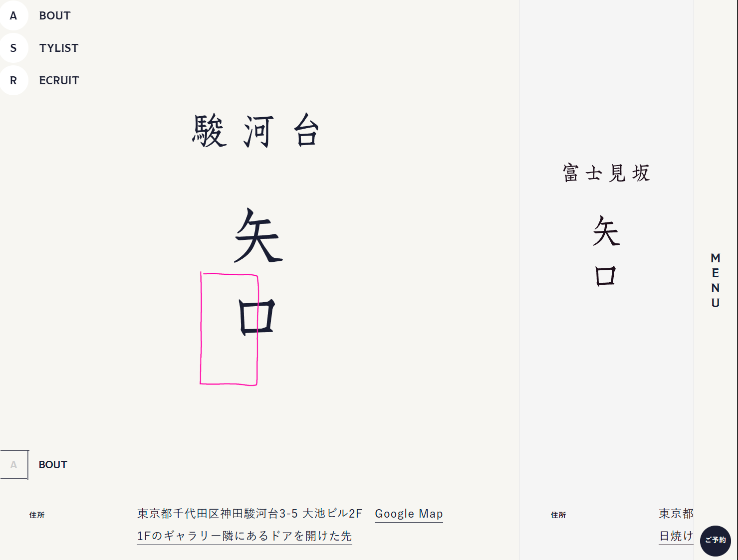 田中さんに作ってもらった「駿河台 矢口(web design: 有本誠司 | Semitransparent Design)」という美容院のウェブサイトもそうでしたね。大げさなモデルの写真はいっさいないシンプルな構成。カーソルがヘンテコな手書きの長方形になっていて、実はそれはお店のドアの形だという、まったく美容院らしくないサイトで。
