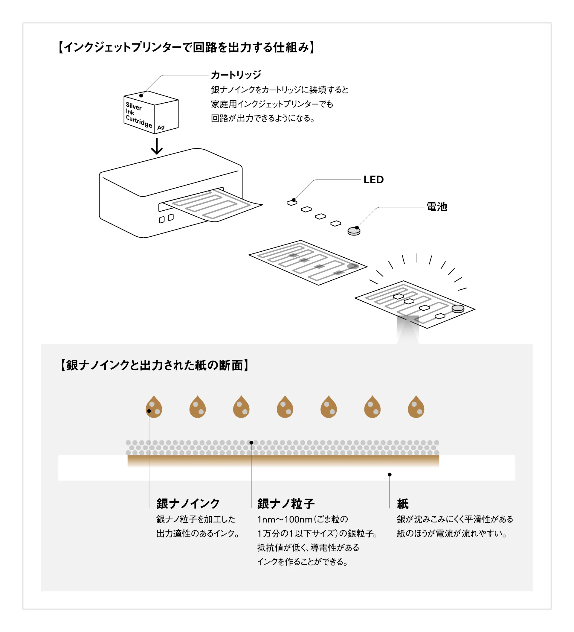数万分の1ミリサイズの銀の粒子が含まれたインクです。カートリッジに装填すれば文書と同じ感覚でインクジェット出力ができます。最大の特徴は、銀ナノインクで印刷した紙が電気を通すこと。つまり家庭でも簡単に紙に電子回路を出力することが可能です。また弊社では、紙に描くだけで回路ができるマーカーも開発しました。身近にある道具で、あらゆる人があらゆる場所で手軽に電子回路をつくれるんです。