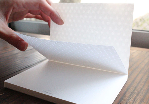 ショップカードに適した200Kgは厚手のため、裏側からは模様の透けはほとんど感じられませんが、薄手の紙とはまた違った味が楽しめます。あられの「しろ」と、きっか・さしこの「ゆき」の、同じ白でも微妙に異なる色味もポイントです。