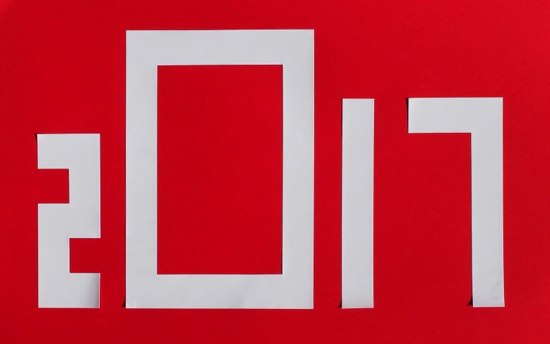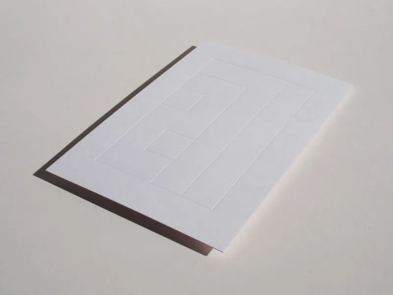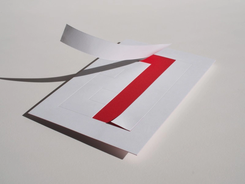 年号である「2017」の数字をかたどったハーフカットに沿って「ルミネッセンス」を剥がしていくと、鮮やかな「NTラシャ 濃赤」が現れます。タック加工には再剥離性ののりを使用しており、剥がした数字を好きなところに貼ることができます。「ルミネッセンス マキシマムホワイト」の冴えた白と、「NTラシャ 濃赤」の鮮やかなコントラストが縁起の良さと爽やかな一年の始まりを予感させるデザインです。(株式会社竹尾 企画部)