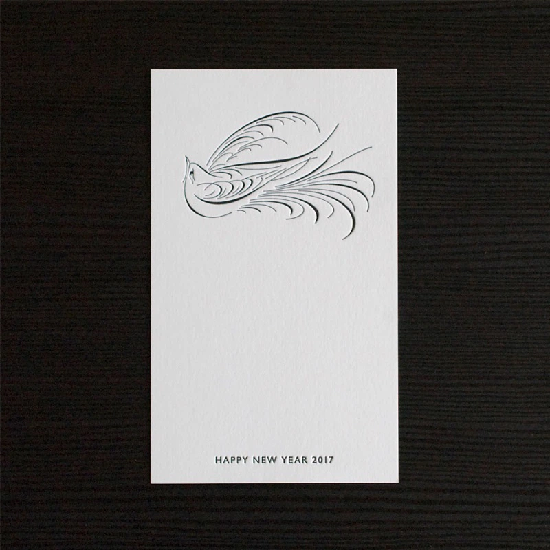 より洗練された印象の活版印刷を表現する為に「スノーブル‐FS」を選びました。厚すぎず、薄すぎず、ほどよい硬質さを持った真っ白な「スノーブル‐FS」に、文字と線画で構成されたデザインはとても相性が良く、ディープレリーフ樹脂凸版特有の深いへこみが綺麗に出ることにより、新年のご挨拶にふさわしい凛とした印象に仕上がっています。(Bird Design Letterpress 市倉郁倫さん)