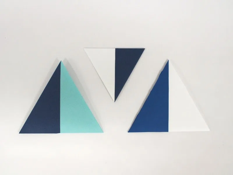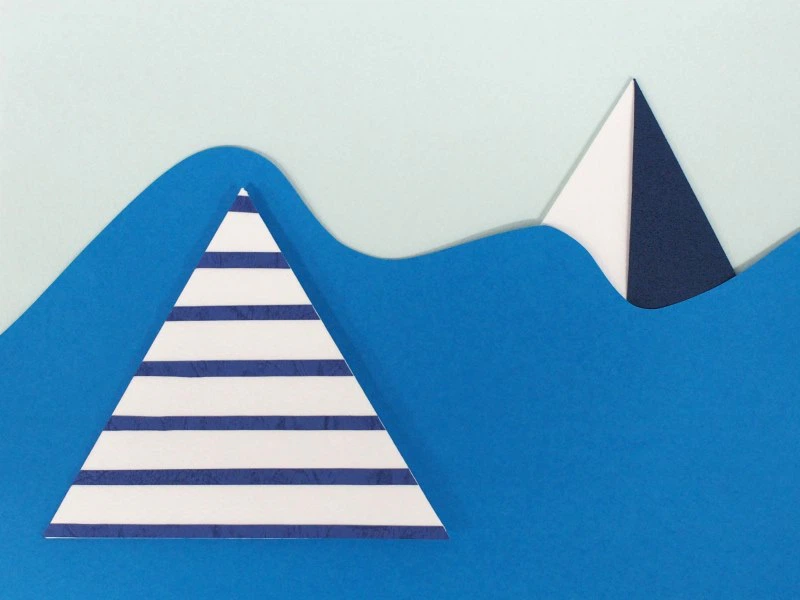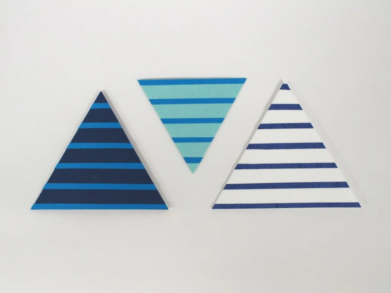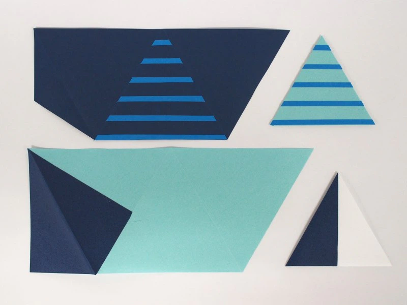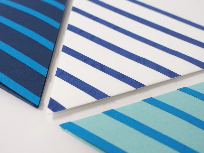 形は、プチバトーさんのヨットの帆をデザインしたロゴをイメージして、折ると三角形になるようにしました。用紙は、イメージカラーの紺色や、ブルー系、白系から、折りやすさ、エンボスの美しさ、発色の良さで選びました。また、ぽち袋の折りの作業がしやすい、薄めの紙で揃えています。プチバトーさんのボーダーも、紙を重ねることで忠実に再現しました。紙の重なりの美しさは、どの紙で合わせても楽しめると思います。(田中千絵さん)