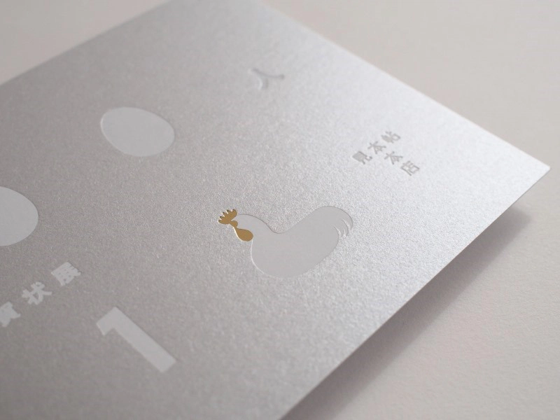 今回「年賀状展」の印刷を考えた時に、「品良くお祝いムード」を出そうと思い、この紙に決めました。一部に金の箔押し加工をすることにより、よりお祝いムードを出すことが出来たと思います。(新村則人さん)