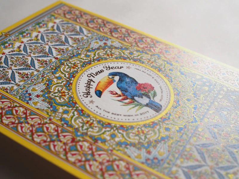 細密なアラベスク模様と手描きイラストの両方を活かすため、温かな風合いがありつつ発色のいい「ヴァンヌーボV」を選びました。鮮やかな多色使いが紙表面の凹凸と相まって、陽気な仕上がりになりました。(株式会社tote 谷井さん)