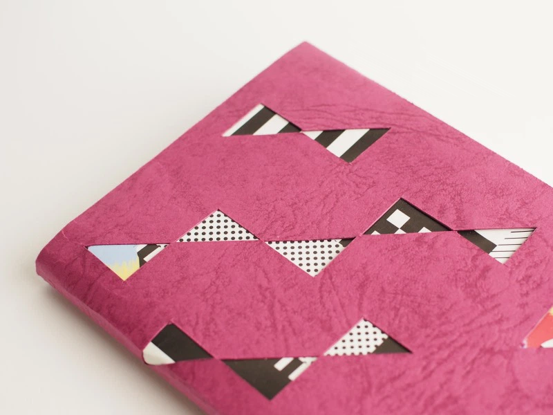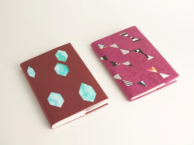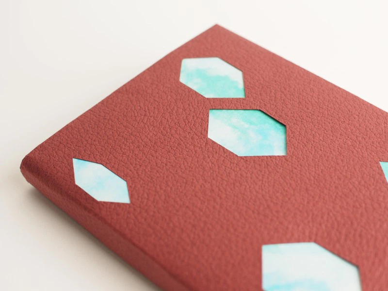 カバーにできそうな強度があれば、いろいろな紙で楽しめるのですが、今回は、着せ替えのチラシや紙の柄が引き立つ深い色、存在感、耐久性のある、しっかりとした紙質という観点から、皮革感際立つ「レザック」シリーズの2種を選びました。「特別な1冊」という”貫禄”がいいですね。ちなみに、「レザック16」と「彩雲 あじさい」を使ったカバーは、鉱石をイメージしています。