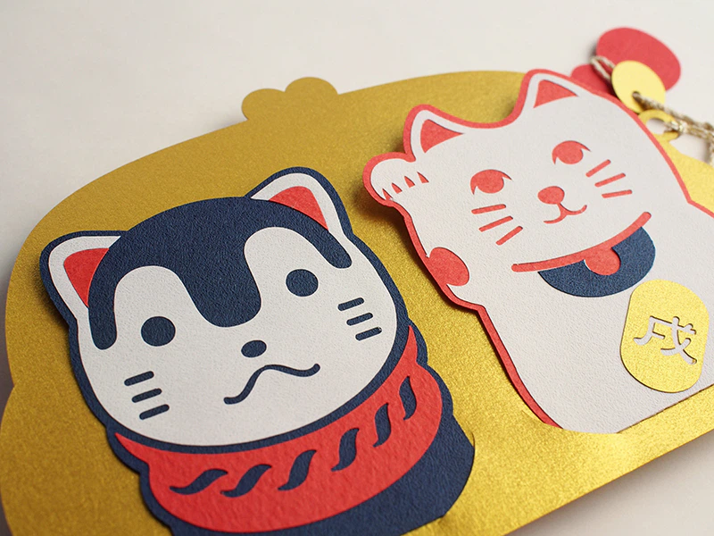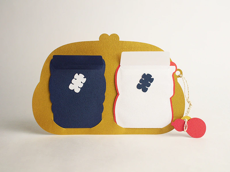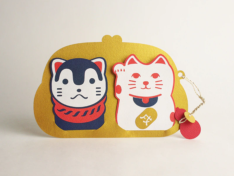 表面の凹凸感や色が和雑貨にとても合うと思いました。台紙は金紙のガマ口財布に瓢箪の根付けを付けて賑やかに。福をテーマにした伝統的な狛犬と招き猫のぽち袋は、赤、あい、白の3色カラーで、可愛らしくポップに表現しました。(ソロルファクトリー サトウナオコさん)