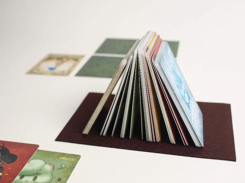 砂山に棒を刺し崩してゆく誰もが知っているゲームをカードゲームとして昇華するためには両面に浮き出るエンボスによって生まれる「サーブル」の摩擦がなければ成立させることができませんでした。数多くを試作してようやくベストマッチの紙を見つける事が出来ました。