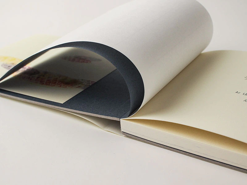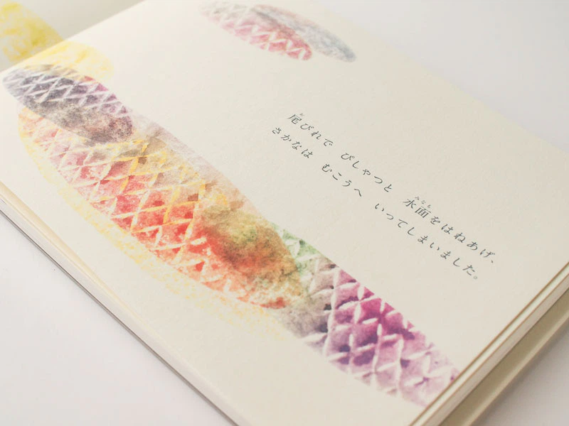 頁をめくる感触も物語への入り口と考え、肌触りの良さを一番に、アラベールを選びました。沙羅さんが和紙に木版刷りした風合いをそのままスキャニングしているため、印刷されると不思議な印象になりました。この本の製本は二つ折りの折り山を背固めし、小口に糊で貼る方法で作っているため、ふんわりしているアラベールが製本上でも良い効果を発揮してくれます。(美篶堂/本づくり協会 上島明子さん)