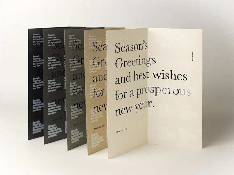 時間が経過する様子を、季節の挨拶文に雪が降り積もるようなイメージを文字の太さのグラデーションで段階的に見せることで表現し、中面では黒箔の上にUVオフセットの白を乗せる試みを行いました。里紙は、日本の風土と自然に調和した素朴な味わいがあるファインペーパーです。自然の温もりとやさしさを感じさせる里紙を海外のお客様にも届けたいという想いで選定しました。(株式会社竹尾 企画部)