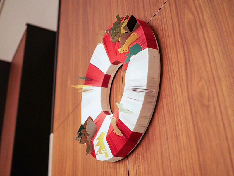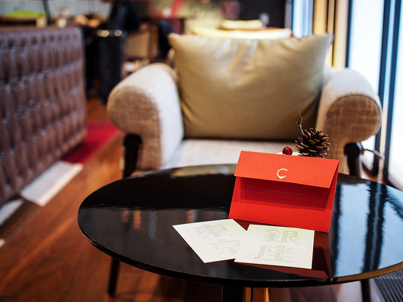 ハイアット セントリック 銀座 東京のイメージの赤と、NTラシャ 濃赤 の相性がよく採用しました。今回のツリーをつないでくれた中村活字さんで、アートディレクター(守田)が初めて作った名刺の紙が竹尾さんの用紙でした。ハイアット セントリック 銀座 東京、中村活字、竹尾の3つをコラボレーションさせることは、アートディレクターにとって活版印刷の原体験につながっていたため、竹尾さんの用紙を使うことにしました。