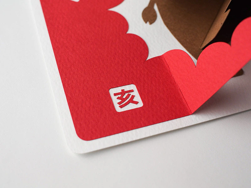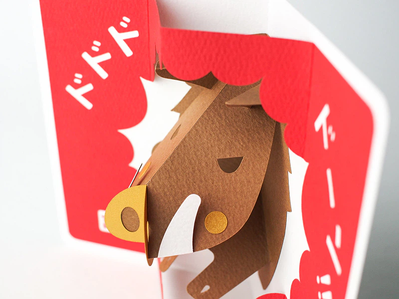 今年の干支であるイノシシの猪突猛進をそのままデザインにしました。勢いよくイノシシが飛び出すイメージとカタカナの文字でポップ感も出しています。ポップアップカードに使用するにはちょうどよい厚みで、 紙の質感も可愛く、イノシシとの相性もバッチリです。(株式会社ソロルファクトリー 山本ちさとさん)