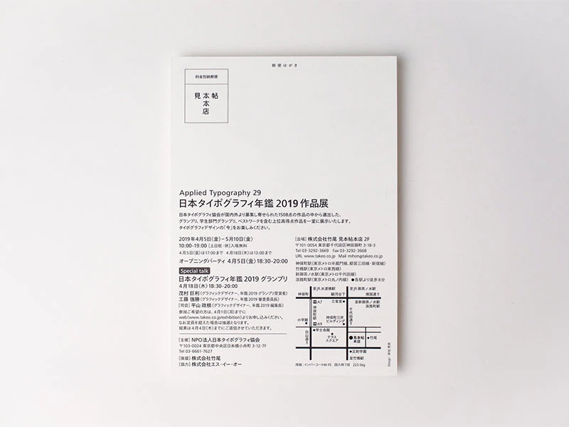 見本帖本店2Fで開催している「日本タイポグラフィ年鑑2019作品展」の案内状をご紹介いたします。