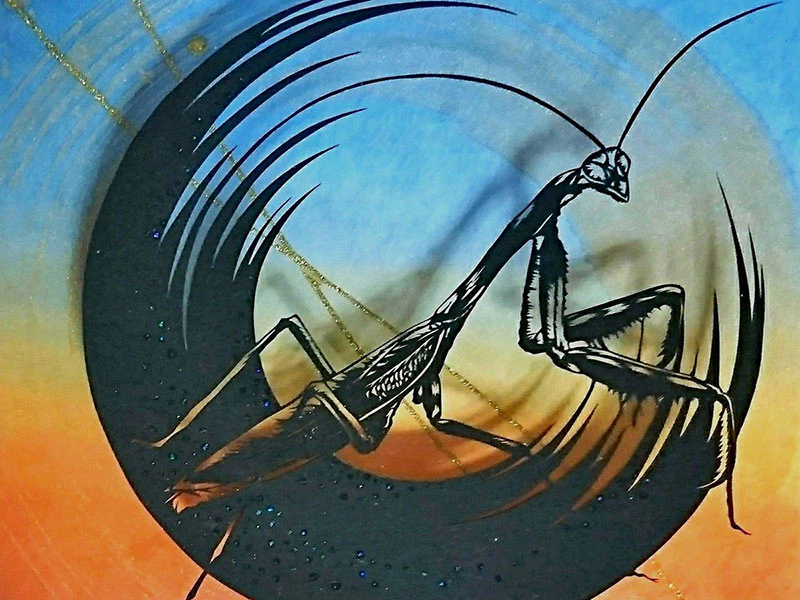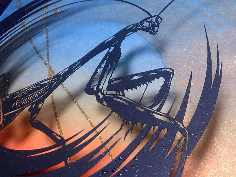切り絵はカットせずに残る平面部分が単調になりがちですが、光の角度で様々な色にきらめくミランダは、逆に平面をアクセントに変えて豪華な風合いを出してくれるので愛用しています。