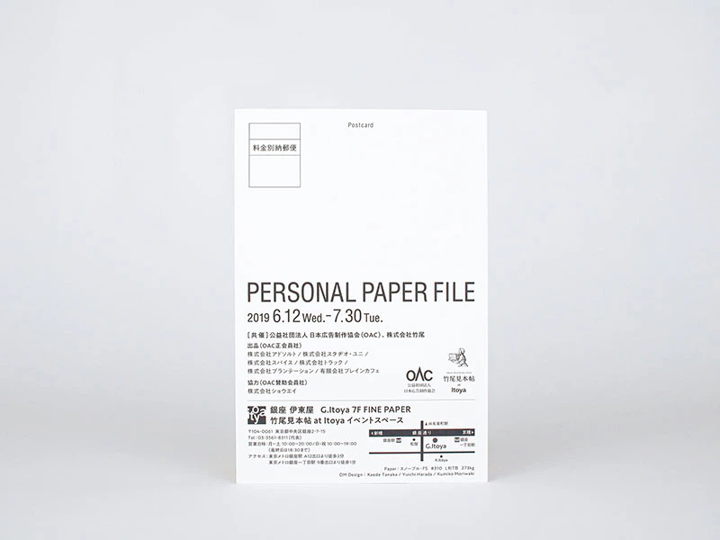 2019年7月30日まで竹尾見本帖 at Itoyaで開催された「PERSONAL PAPER FILE」展のDMをご紹介します。