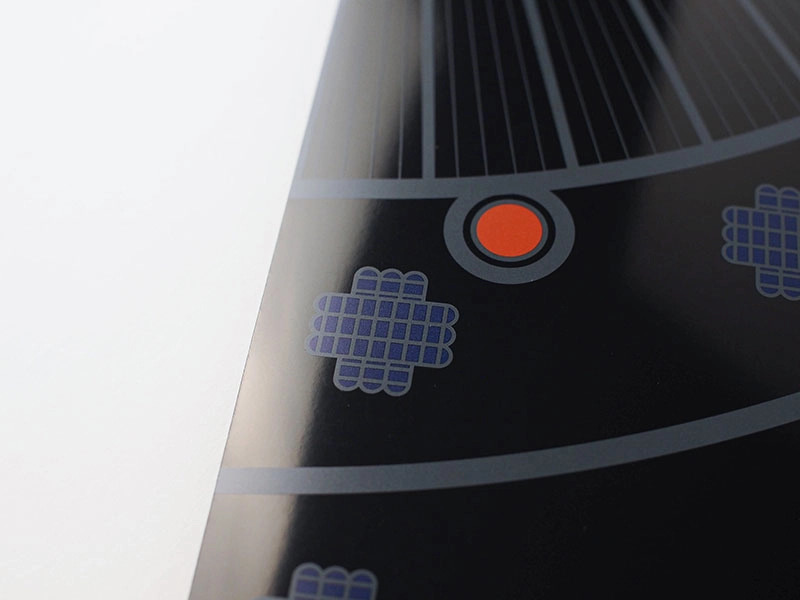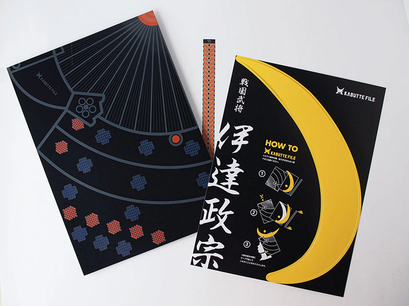 「LK カラーN-FS」の持つマットな印象の光沢が兜の漆の質感に似ていることと、紙の丈夫さからこの紙を選択しました。ペーパー「LK カラーN-FS」黒の色を生かす為、白インキで色部分を印刷しその上から色の版をのせて特色4色で印刷しました。