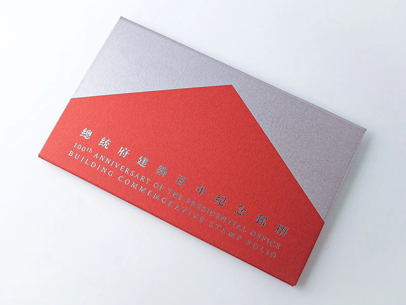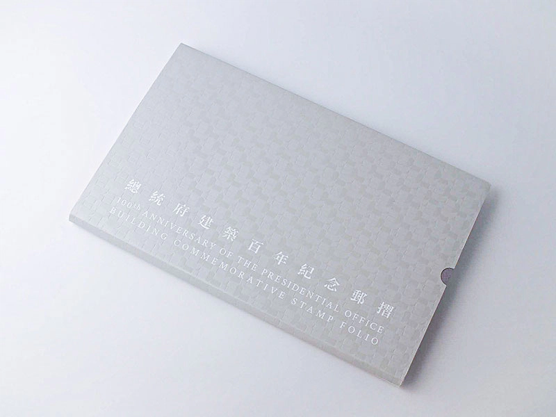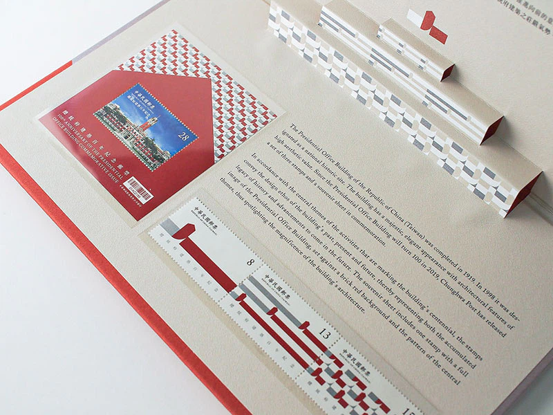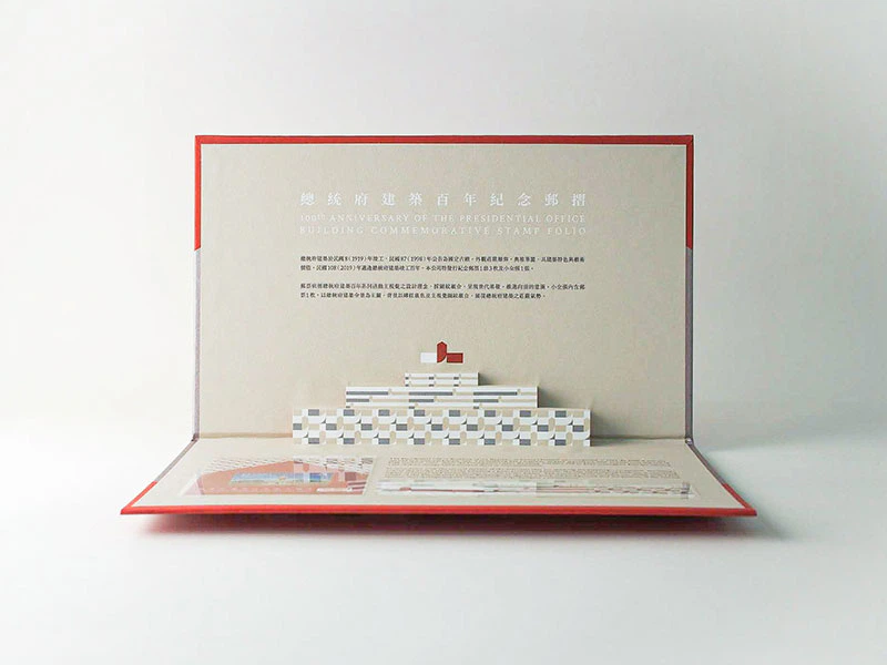 全体的に総統府建築百年記念の一連の活動のメインビジュアルのコンセプトデザインに従っており、パターンの組み合わせは世代の蓄積と進歩の意味を表しています。中には3枚1セットの記念切手及び1枚の記念切手が収録されており、フォルダを開くとポップアップになっていて建築の特徴と芸術的価値を表現しています。
