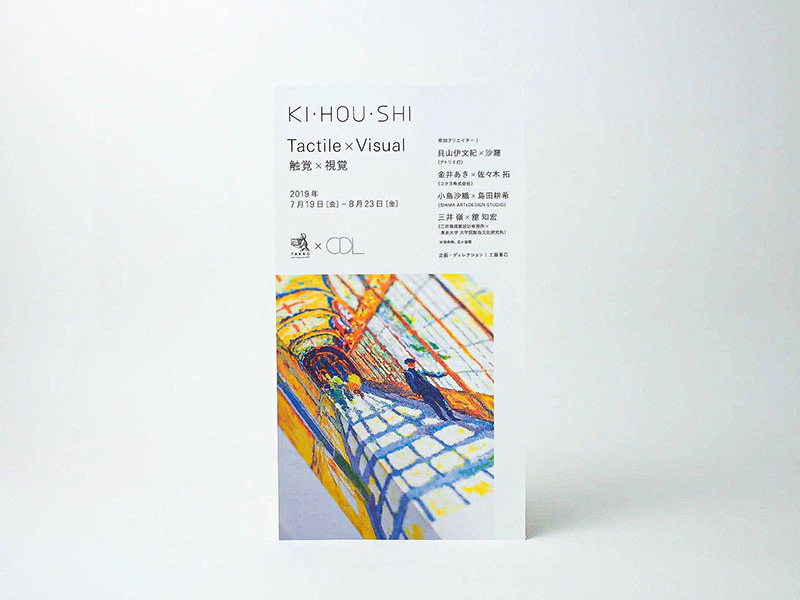 前回の展示 では定形外のサイズに合わせ一番厚い連量を案内状に使用していましたが、今回はポストカードサイズということもあり一段階薄い255kgを選んでいます。しっかりした紙の存在感にもご注目ください。(株式会社竹尾 企画部)