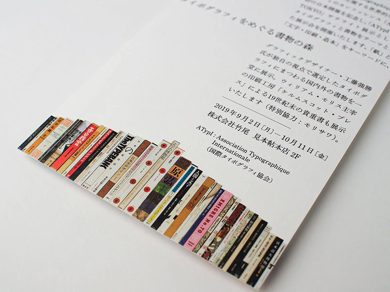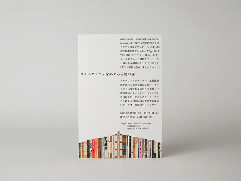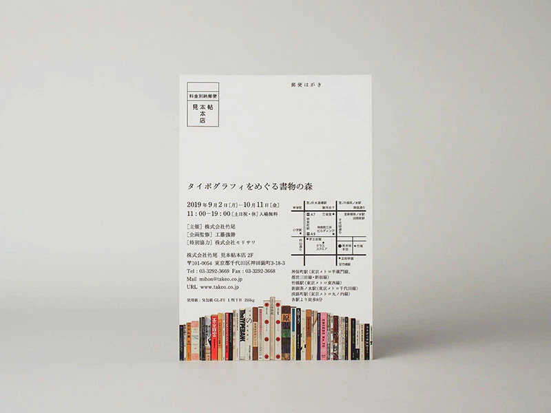 「タイポグラフィをめぐる書物の森」という展示タイトルにちなんで、表裏で書籍が連なっているデザインの案内状です。