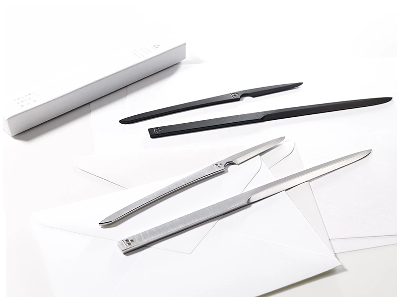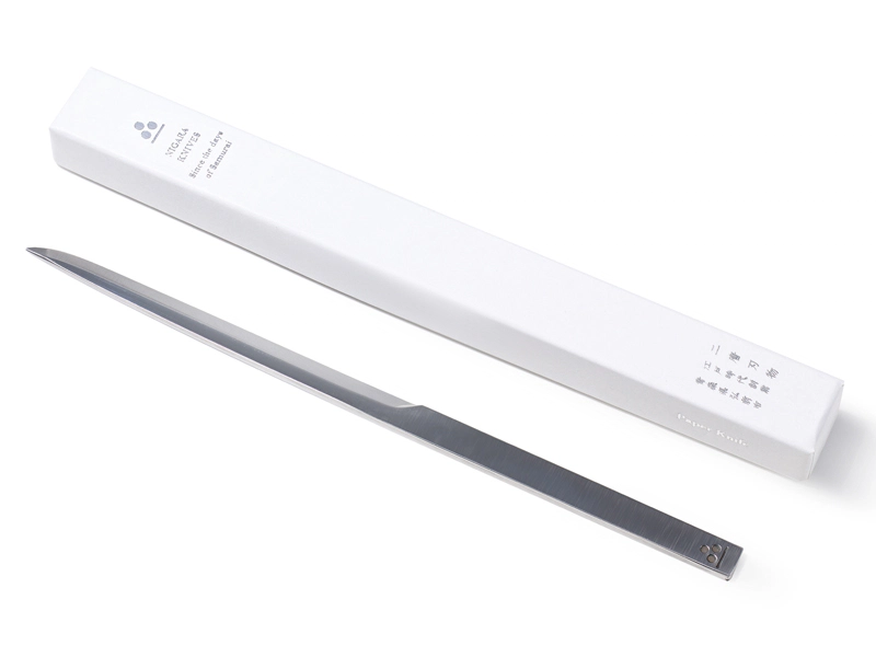 二唐刃物のある青森県弘前市は津軽地方と呼ばれ、平安時代は大規模な製鉄が行われていました。江戸時代になると100軒以上もの鍛冶屋があったと言われており、その中の1つである二唐刃物は350年の伝統があります。ペーパーナイフはその伝統と技術をお手元で楽しんでいただこうと鍛治職人が一本一本丁寧に仕上げたものです。刀をイメージしたペーパーナイフとレターオープナーを収める函には、独特な手触りが高級感を感じさせる「NTスフール」の中から、青森の雪のようなスノーホワイトを選びました。(長澤昌彦さん)