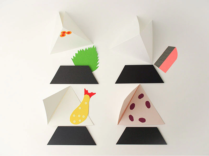 角を丸くせず、紙のエッジを最大限に活かすことで、おにぎりの存在も甘すぎず、シャープになります。