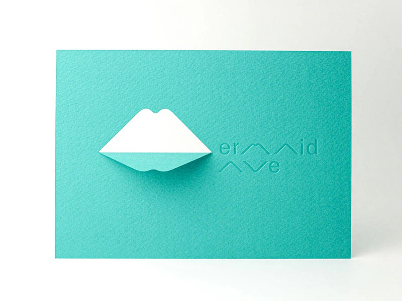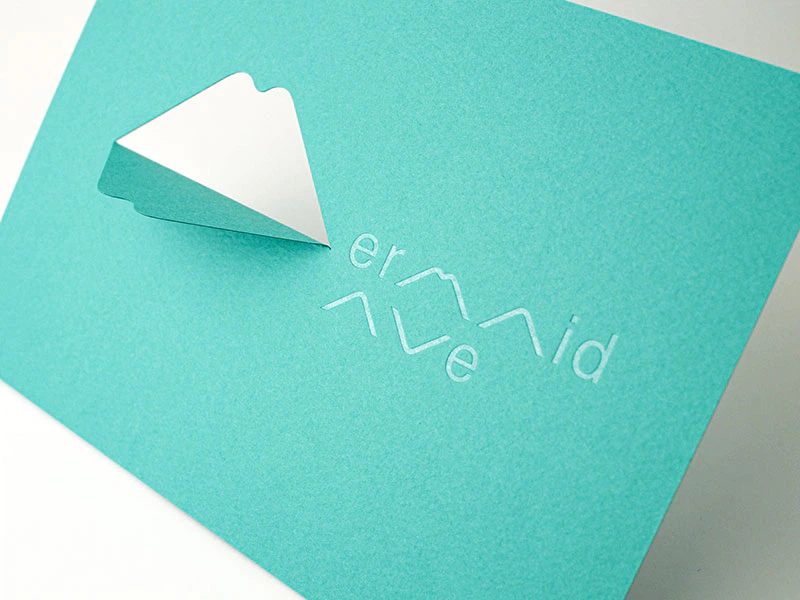 柔らかな触感と強度を兼ねそなえ加工への可能性が大きく広がった、マーメイドの厚紙の魅力が伝わるように、抜き・筋押し・箔押しで展示のロゴを施しました。