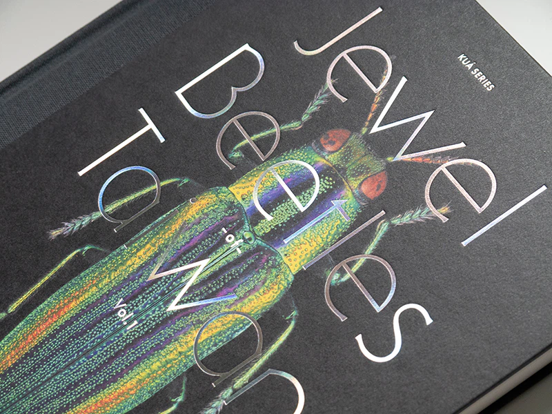 本のテーマが金属のような光沢を持つタマムシであった為、箔押しによる金属光沢のあるタイトル文字がカバーデザインの重要なポイントになりました。