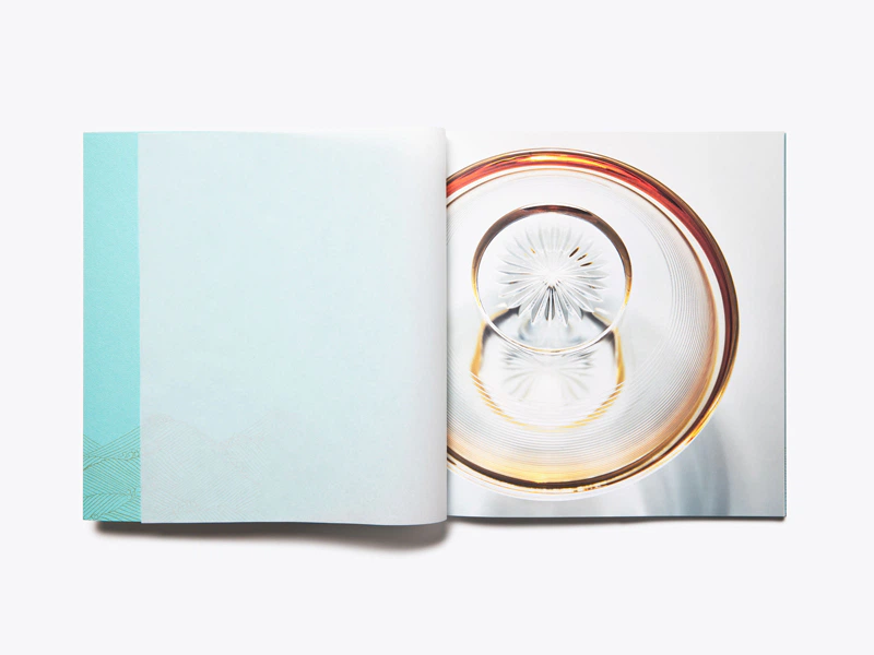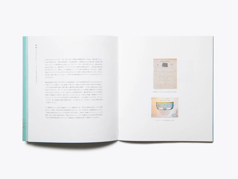 1901年、大阪の春海商店 三代目藤次郎とバカラの出会いから約120年の時を経て、令和の「春海コレクション」として復刻された商品のカタログ。春海という名の通り、春の海を表現するあさぎ色と、当時を回想させられるい織りをセレクト。
