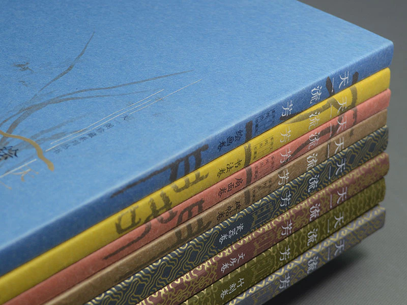 设计上如绘画、书法、扇面、碑帖、文房五卷,使用了泰拉纸系列色的本色,其余三卷则通过印刷专色的方法,最终形成读者看到的一浓一淡两组系列色彩。为了保留肌理效果,我们只在很小的区域内设计图像与书名,反而将大面积的空间留给纸张本身。套书名“天一流芳”四字和与分卷名相呼应的直线、曲线则使用了烫金工艺。金色的细丝线在纸表留下细腻的痕迹,只有在不同的角度可现。
