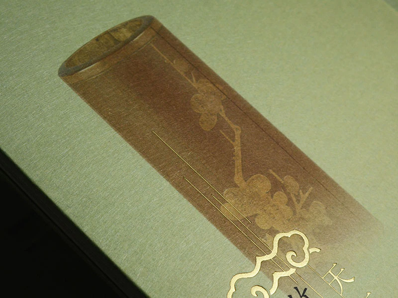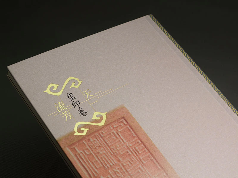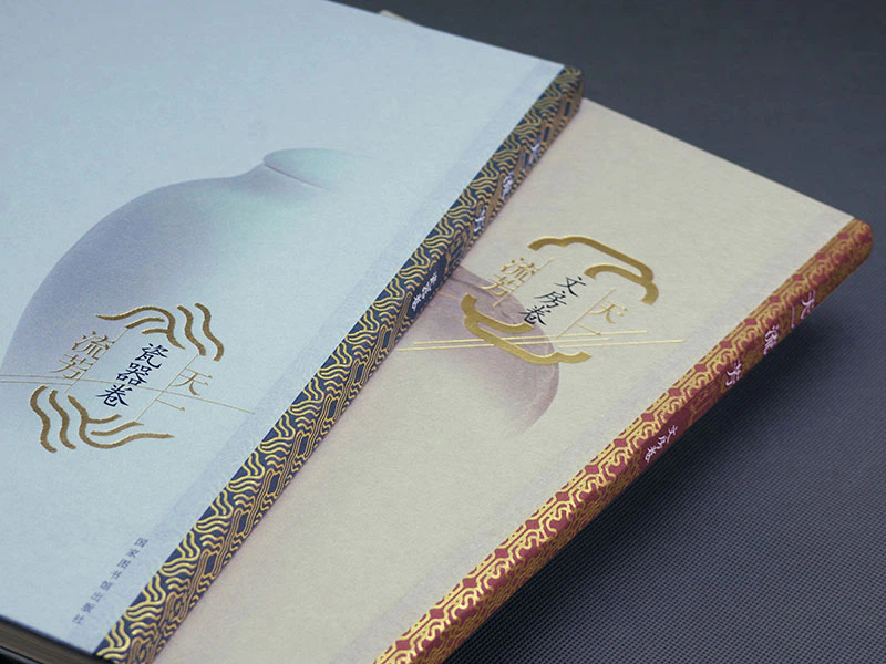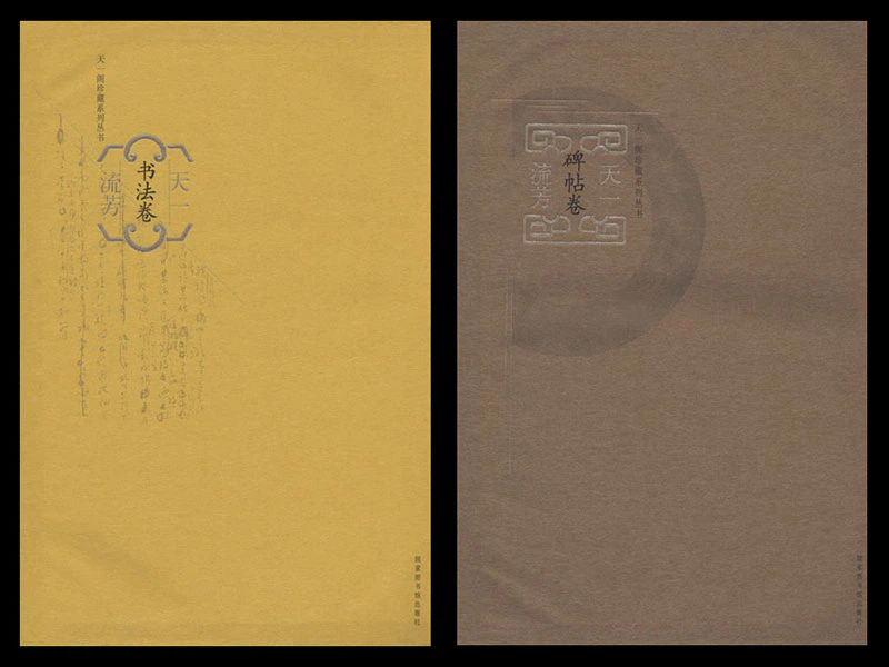 《天一流芳/天一阁珍藏系列丛书》第一辑分绘画、书法、扇面、碑帖四卷,采用中国传统包背装形式装订。第二辑分竹刻、瓷器、文房、玺印四卷,采用西式方脊精装形式装订。封面采用竹尾泰拉纸,这款特种纸的纸表有蚕丝般的细腻肌理,质地则有织物般的柔软手感。天一阁藏书楼历史超过400年,史建于明代,是中国现存最为知名的藏书楼之一。藏书与安定富庶的生活环境密不可分,丝织品的生产与贸易一直是中国江南地区的经济支柱,泰拉纸的这种气质刚好与书的主题相符。