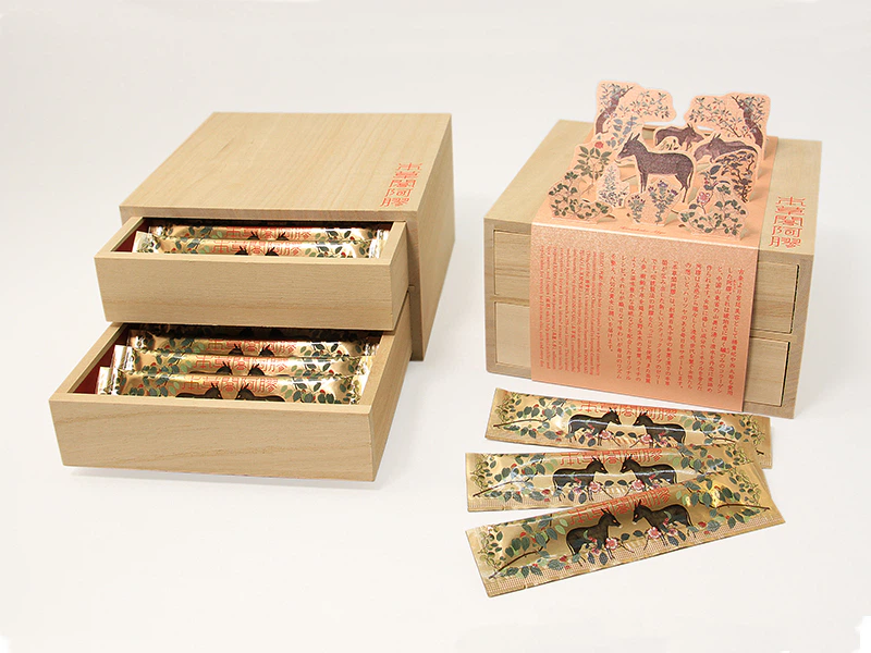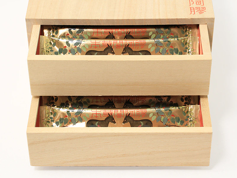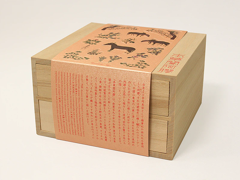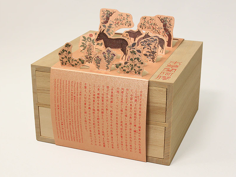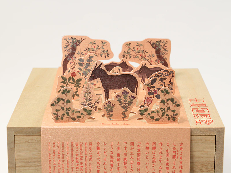 「本草閣 阿膠」 は創業190年の漢方薬局が開発販売するコラーゲン食品です。木箱は漢方薬局の薬箱をイメージ。健康食品は毎日食べ続けることが大切ですが、食べ忘れが起きがちなため、スリーブに工夫を施し、食べる度にイラストが起き上がって原材料産地の豊かな自然風景が現れる仕掛けにしています。
