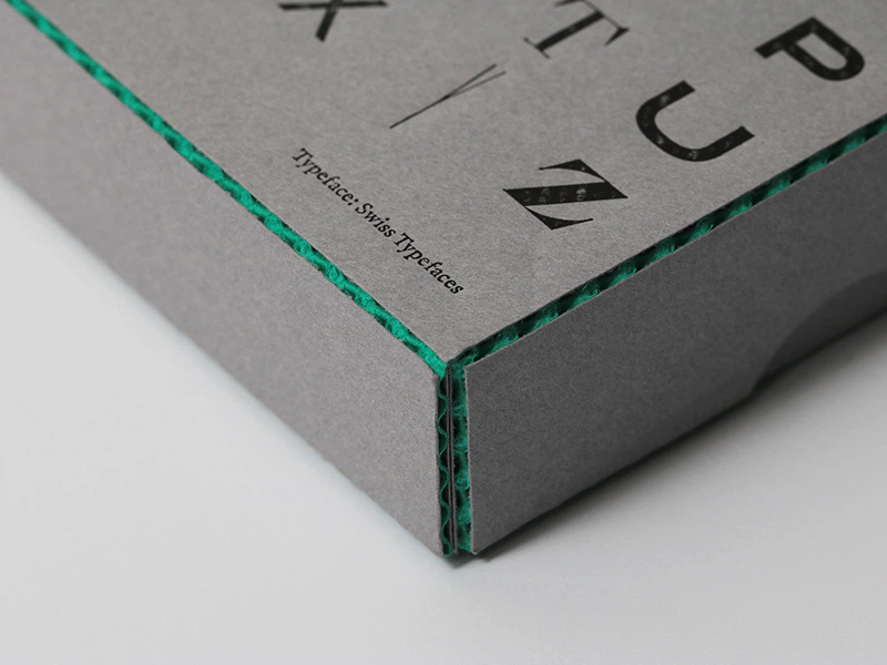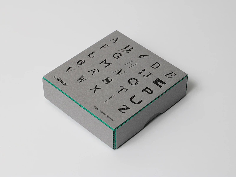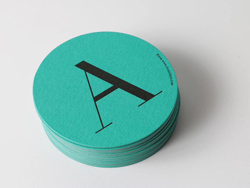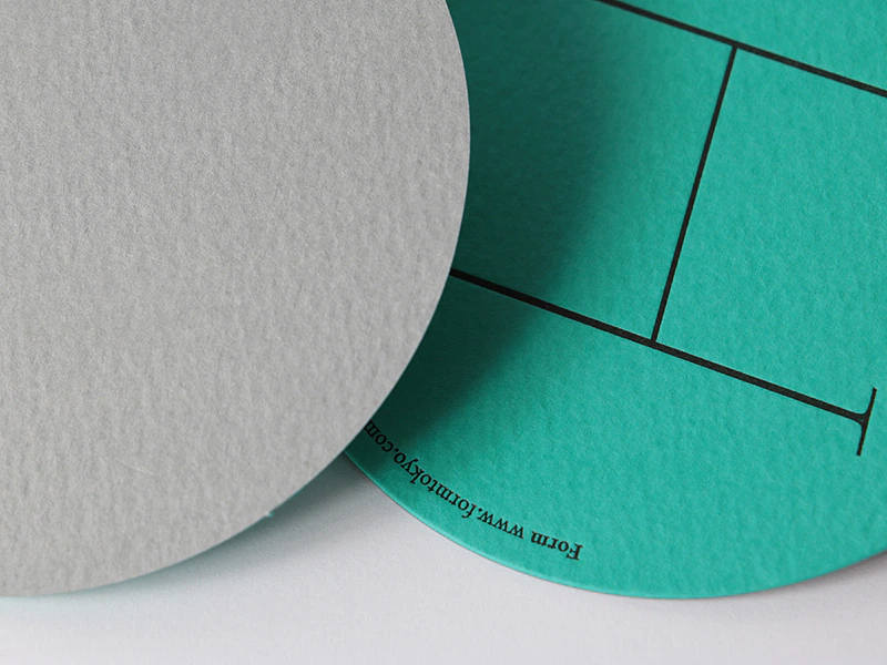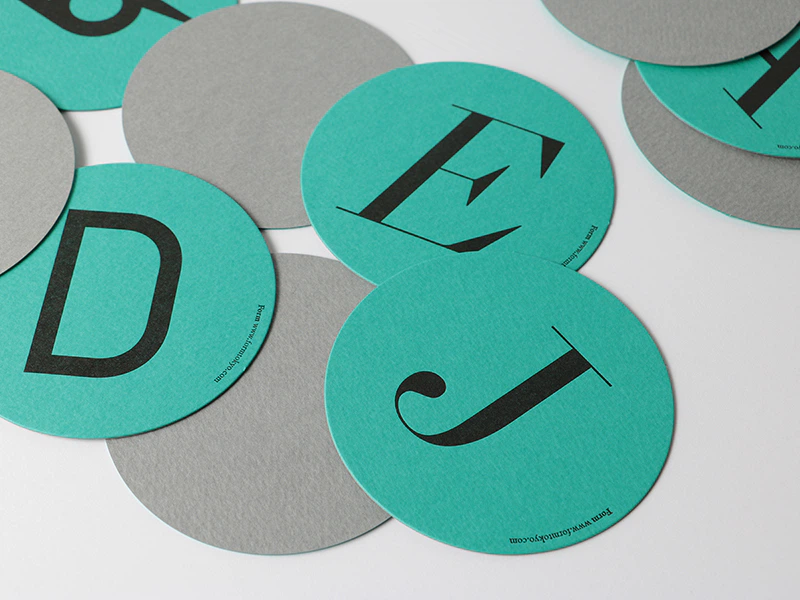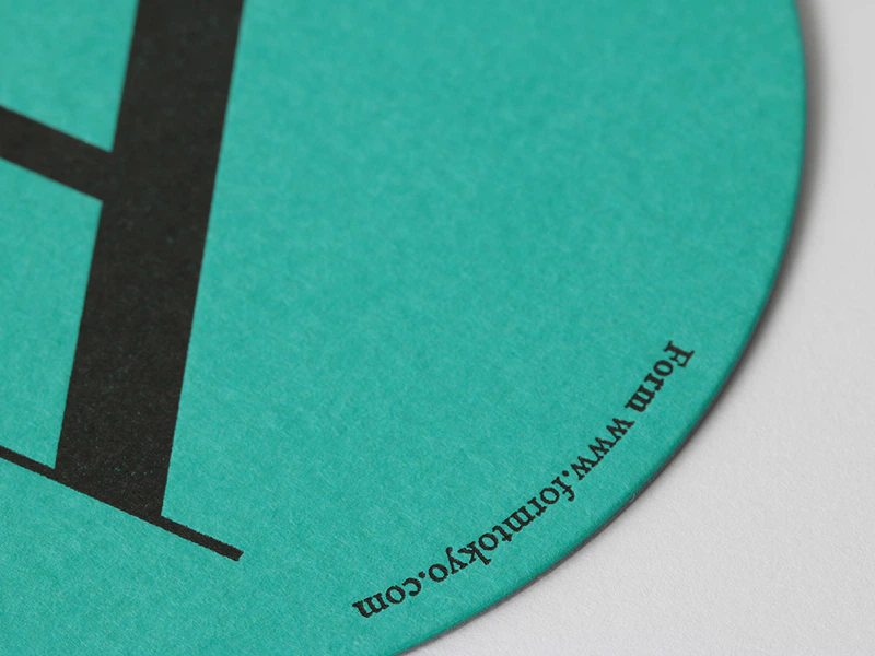 FormでコラボレーションしたSwiss Typefacesの書体をビビットな色合いで表現するためコースターは「マーメイド」のターコイズを、「ファインフルート」は箱の上品なイメージにデジタルフォントを木版で印刷したかのような表現をするため選びました。(丸山新さん)