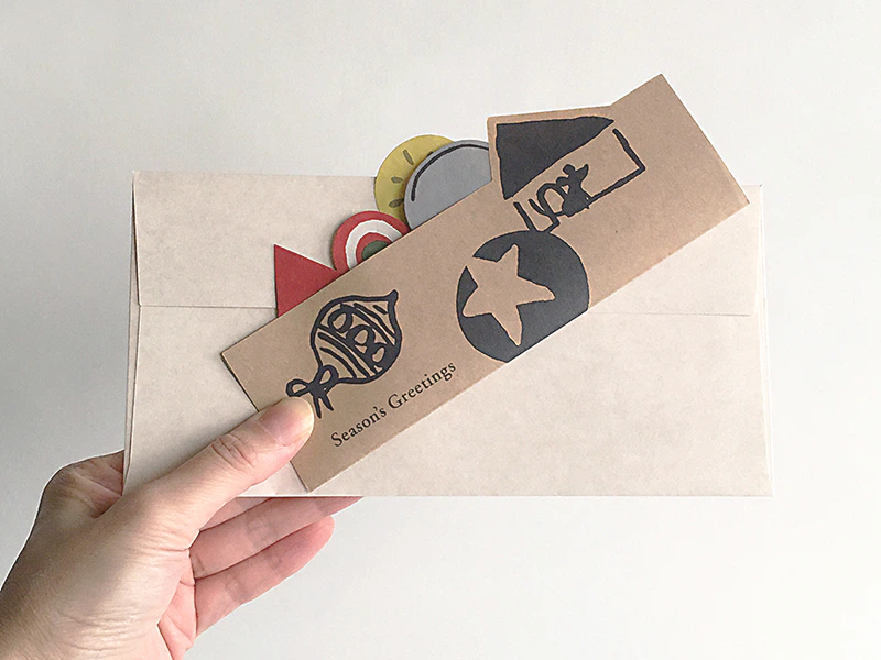 毎年1つ新作を加えつつ、しかけのあるグリーティングカードを制作しています。 今年はクリスマスの定番・ツリーです。イラストがにぎやかな、チラシのような手軽な質感をイメージ。「クラフトペーパー デュプレN」の片面の白でそれをかなえつつ、畳んだときも裏のクラフトペーパーの茶色と相性の良さそうなカラーでまとめました。閉じた時と開いた時、二つの顔を分かりやすく表現できる素朴ながらも頼もしい紙です。(井手久美子さん)