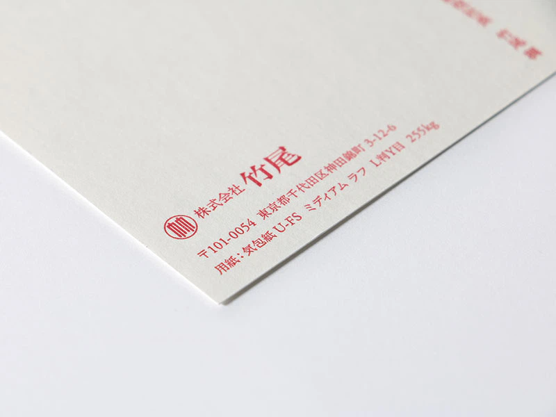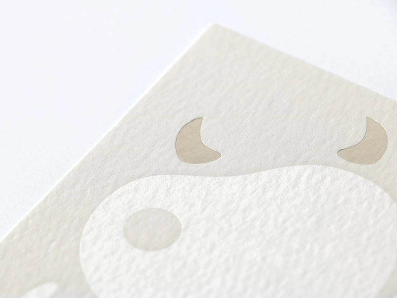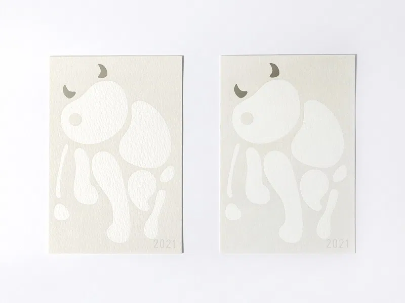 2021年の年賀状は、「マーメイド」「気包紙 U-FS」の2種類で制作しました。今にもスタートを切って動き出しそうな躍動感のある、力強い牛の姿が描かれています。角部分はマットシルバーの箔押し、年号と背景は活版印刷、牛の体部分は紙地の白を活かしたデザインです。均一に美しく印刷されたベタ面と紙そのものの白地との質感の差異が際立って感じられる仕上がりになっています。