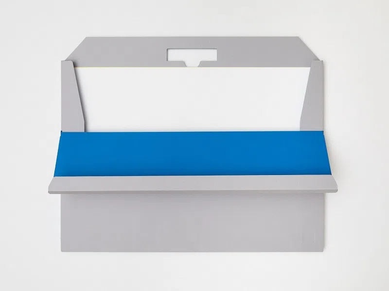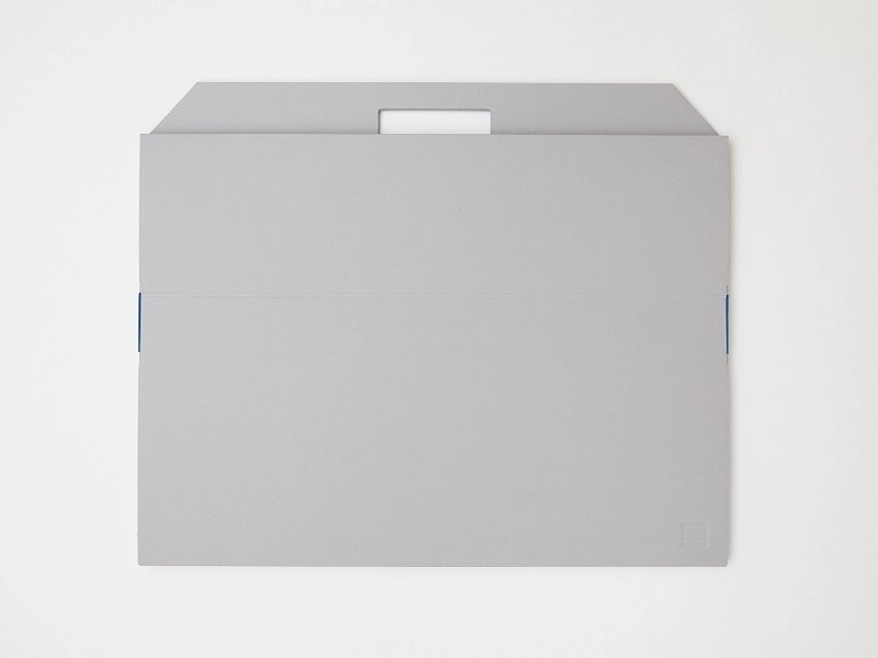 このために作ったオリジナルのファインフルートは、外側のライナーがグレーで中芯と内側は青山見本帖のブランドカラーの青を選びました。ケースの大きさは全判4切サイズがすっぽり入るサイズです。形状は協進印刷の千田健一さんと一緒に、持ちやすさや開きやすさや強度、そしてフォルムも細部まで何度も検証し、長く愛用していただけるよう極力無駄を省きました。最後にロゴもさりげなく空押しして完成。
