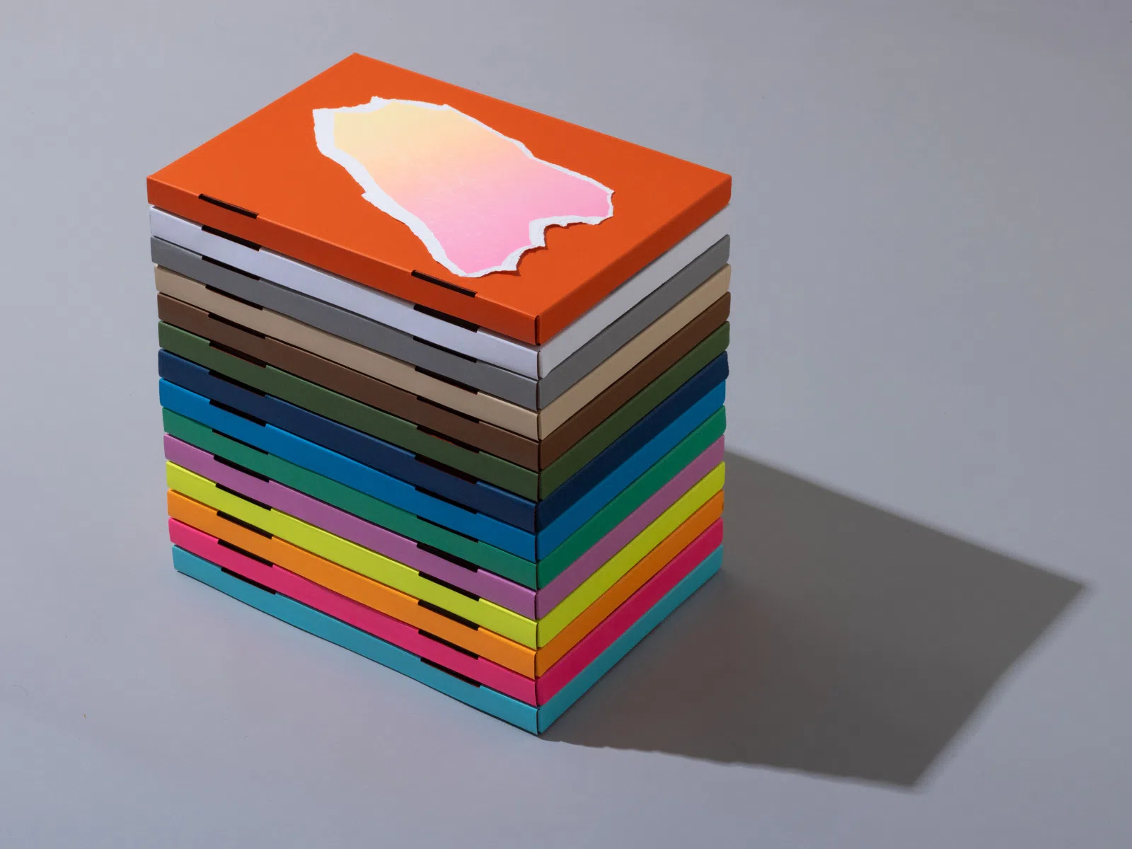 また、15周年と掛けあわせて作品集の見返しを15色展開(通常版1色・特装版14色)にしました。マットで風合いがありつつも、紙の表情より色が先に立つNTラシャとアストロブライト-FSで15種を揃えました。ファインフルートにこの見返しと同色の紙を貼合した特装版用BOXは、色面が放つ迫力が印象的な仕上がりとなりました。(SPREAD 小林弘和さん・山田春奈さん)