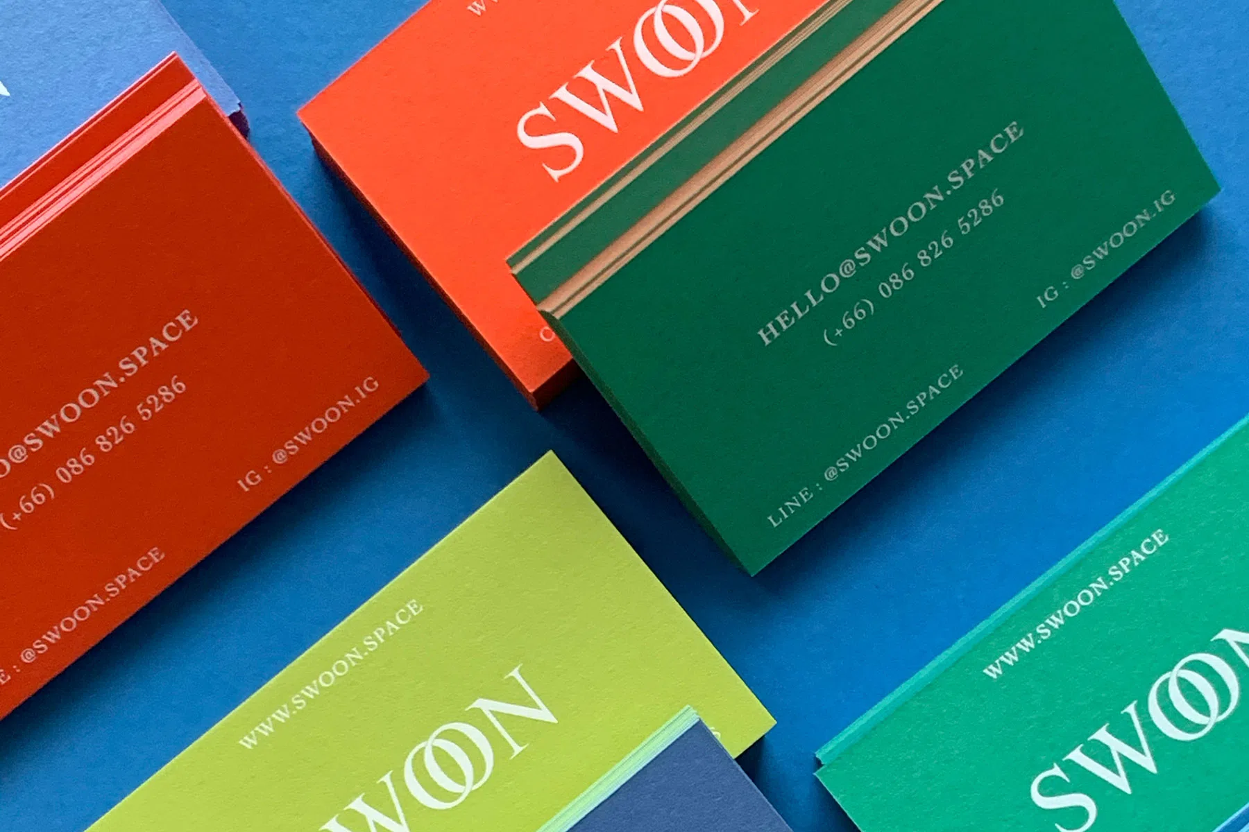 ด้วยกระดาษ NT RASHA ที่เราเลือกมีสีสันที่ฉูดฉาด ดังนั้นเราจึงเลือกพิมพ์โดยการสกรีนสีขาวทับลงไป เพื่อไม่กลบสีและเนื้อสัมผัสของกระดาษ ให้ตัวอักษรมีความชัดและโดดเด่นขึ้นมา ให้คนสามารถอ่านได้ง่าย และให้นามบัตรดูมีลูกเล่น ไม่เหมือนการพิมพ์ธรรมดาทั่วไป