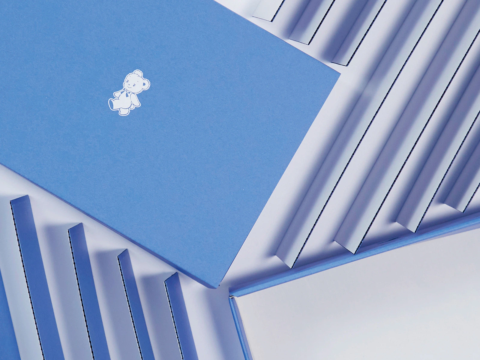 ブルー・ピンク・グレーのバリエーションを表現するために、豊かな色と美しさを合わせ持つ「ファインフルート」をセレクト。澄んだ空の色のブルーは、ファミリアのコーポレートカラーです。富士山の麓、静岡県の製紙工場で何度も色調整を行い、オリジナルの紙を創作。クマのアイコンは、シルクスクリーンで丁寧に仕上げました。パッケージとしての用途だけでなく、 収納箱や工作素材としてもサスティナブルにお使いいただけるように想いを込めたデザインです。(株式会社ファミリア)