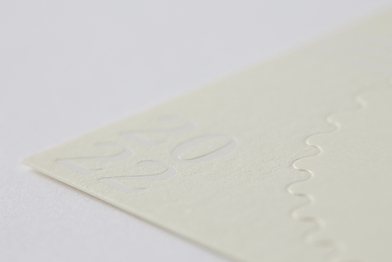 ソフトで温かな自然な素材感のファインペーパー「ロベール」に、優しいパール調の輝きを持つ「New特レーブル 輝き」を紙象嵌(かみぞうがん)加工で貼り合わせ、その上から白い箔押しを施しています。