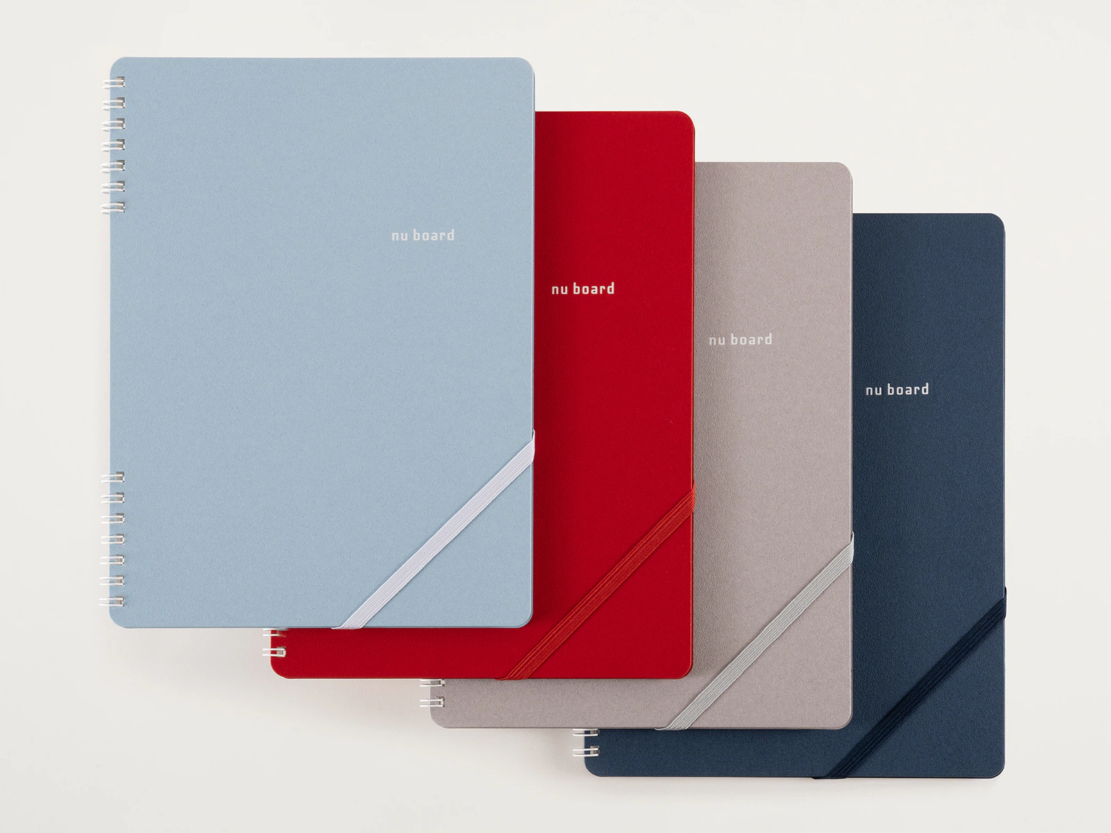 「A4復刻版」は発売当初のクラフト感のある表紙を継承しつつ、新しさと面白い手触りを表現したかったので「D'CRAFT ドット」を使用しました。「Square」は雑貨的なイメージのnu boardにしたかったので、キュートな色が選べてさらに手触りがサラッとしていて気持ちのよい「ミニッツGA」を使用しました。「B5判」は学生さんなどの若い人にももっとnu boardを使ってもらいたいという想いから、欧米の高校生や大学生が持っているようなイメージで、持っているだけでオシャレ(笑)に見えるようにしたかったので、発色のよいレッドやネイビー、スモーキーなグレーやスカイブルーが選べる「サガンGA」を使用しました。質感が少しレザーっぽい感じもあるので、大人が持っても品良く見えると思います。