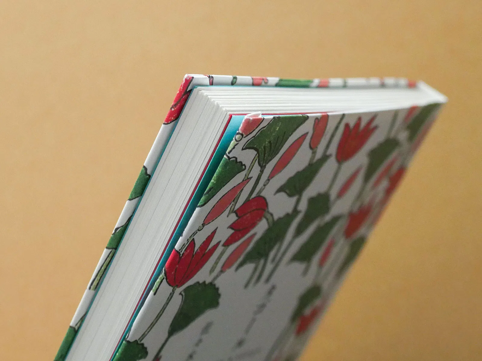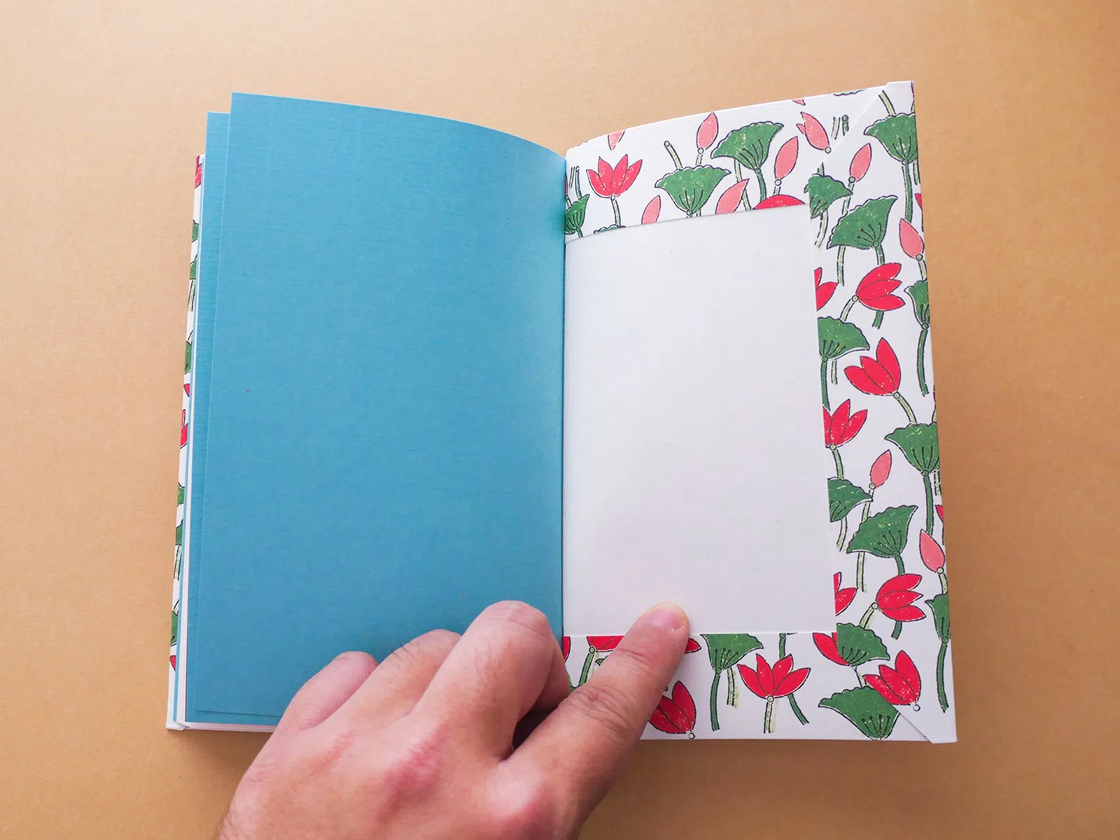 カバーなしということもあり、防傷防汚の機能のある「気包紙 C-FS」を表紙につかいました。幅広の帯はどこか懐かしさもある片艶晒クラフト紙である「クラフトペーパー グロスホワイト」。表紙の蓮の花のブロックプリント模様からの、見返し用紙、「ポルカレイド ソーダ」も爽やかです。本扉の「NTラシャ 濃赤」にはLR輝きシルバーインキでタイトルと著者の手書きのベンガル語も。まるで手紙のような軽やかさ、熱い想いがぎゅっとつまった本になりました。