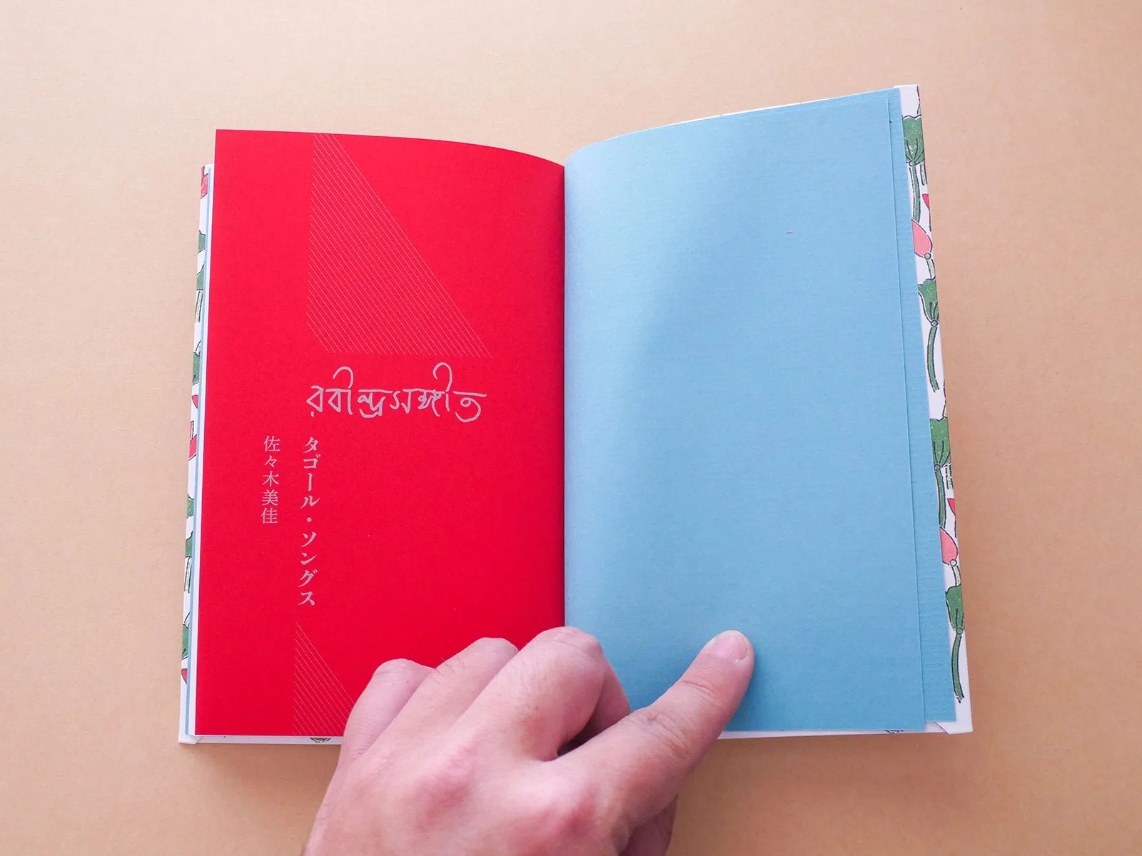 仮フランス装で、天アンカット。表紙と見返しは接着せず、仮フランス装特有の折り返し部分がちゃんとみえるかたちにしたい。インドやバングラデシュでいまも人々に歌い継がれているタゴールの歌を追ったドキュメンタリー作品『タゴール・ソングス』。本書にぴったりの造本だとおもいました。