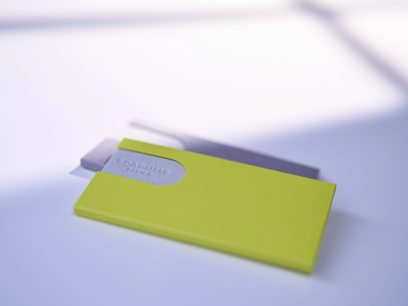SOAPUME PAPIER(ソピューム パピエ)は「香り」にこだわった紙石鹸です。中身の紙石鹸は老舗の和紙メーカーによる製作で、中身だけでなくパッケージも出来るだけ「紙」を使用できればと思い実現したパッケージです。スライド式の「身」の部分はチップボールをビク抜きしたものを合紙し、断裁することによって、しっかりと厚さのあるパーツにすることができました。スリーブには独特の手触り感のあるサガンGAを使用し、形状はシンプルでモダンな佇まいでありながら、色彩や触感によって優しさや温もりを感じさせることを意図し、制作したパッケージです。(石田清志さん)