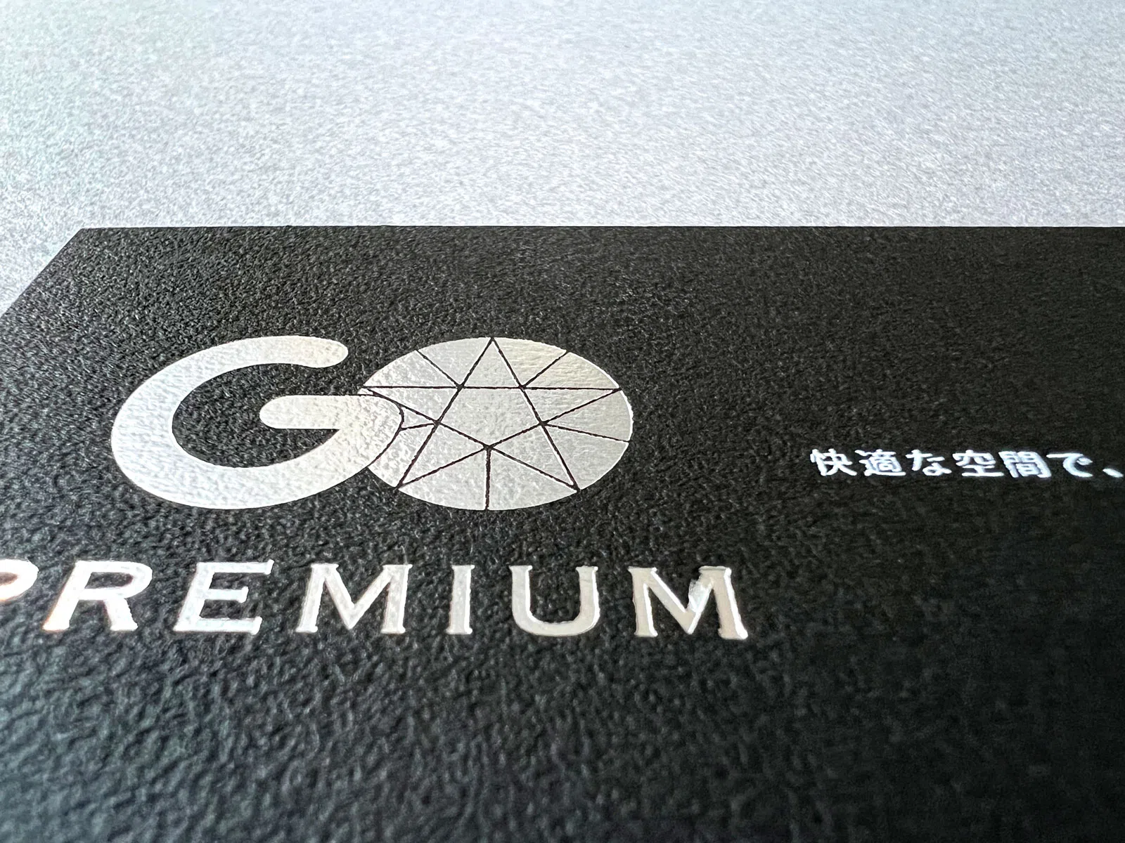 「GO PREMIUM」のカードは、プレミアムだからこそ手に取った瞬間に「違い」を感じて欲しい。表面は箔押しとシルクスクリーン印刷、裏面はオフセット印刷で白とシルバーを重ねて刷っています。そこに「サガンGA」のカラッとしたテクスチャを加えることで、質感のコントラストを狙いました。(中村竜太朗さん)