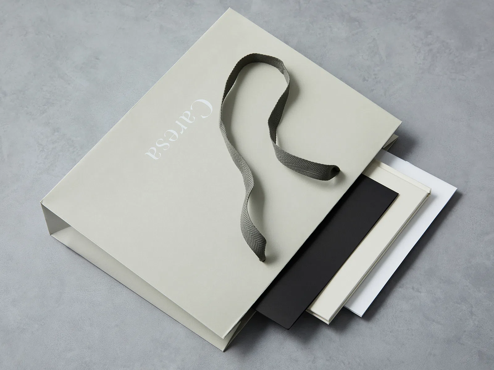 一つ一つのツールにおいて、シンプルでありながら上質であることを心がけており、特にブランドブックの表紙で使用した「ジャガードGA スモークホワイト」は、布張りの上製本のような上質さを持ちながら重苦しくならないのがセレクトポイントです。また、本文で使用した「テイクGA-FS」は、インキが沈みすぎず程よい発色で表現されているのと、ページをめくるときに感じるしなやかさがこのブランドの世界観にピッタリだと感じました。